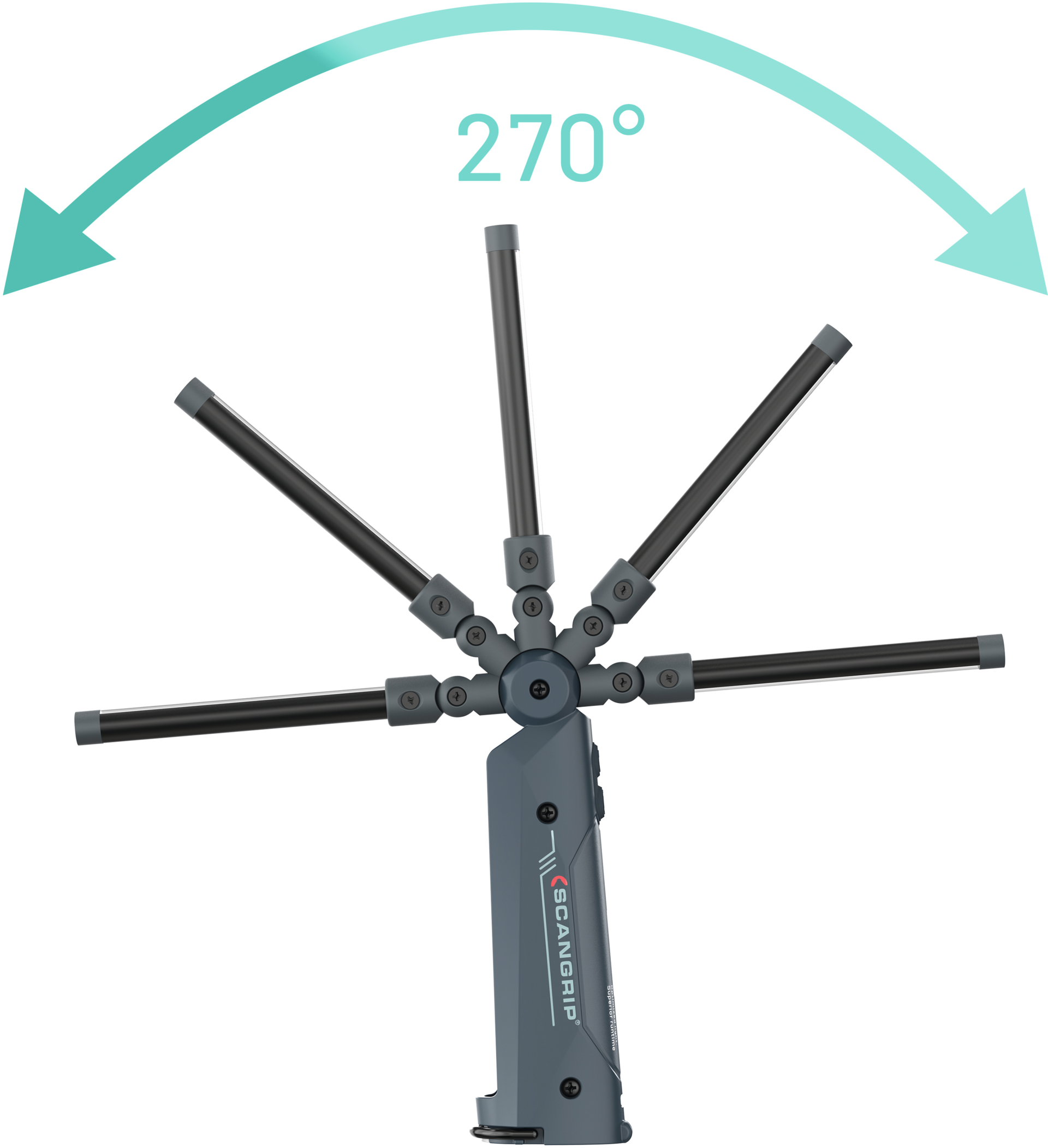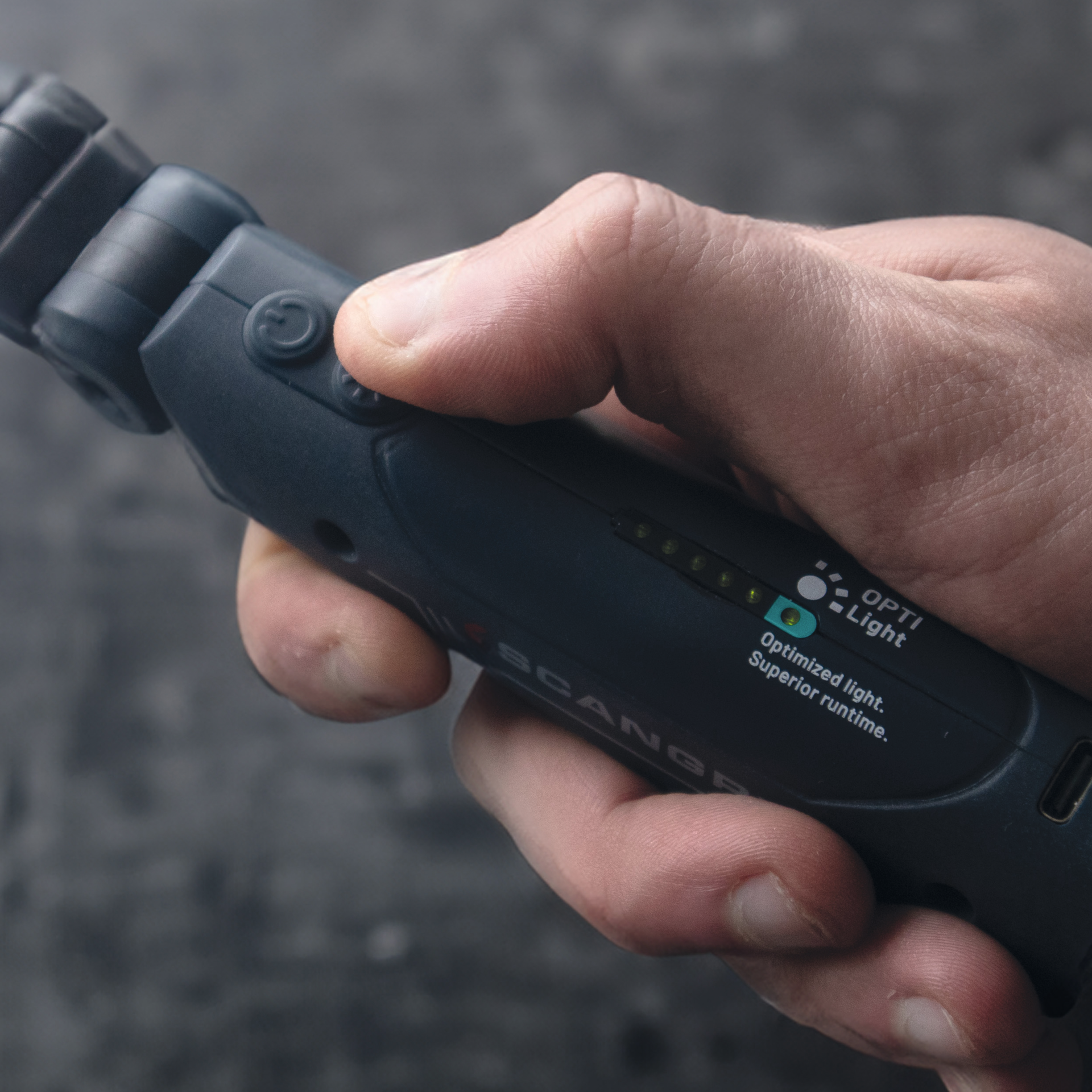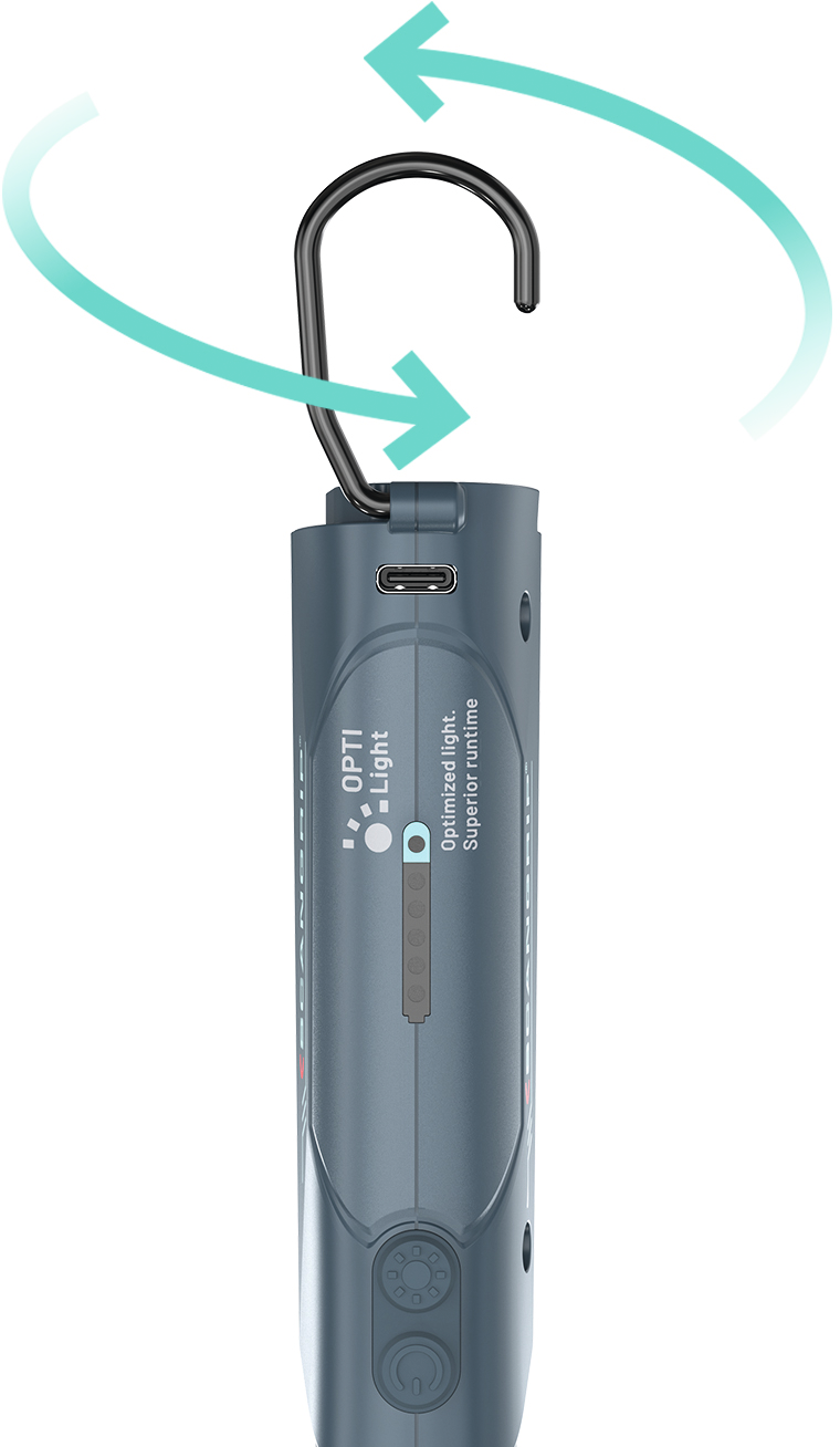 Inspektions-, Arbeitsleuchte und Taschenlampe in einem Produkt, ultra schlankes Design, bruchfestes Gehäuse und robuster Gummioberfläche, flexibler Leuchtenkopf 270° schwenkbar, OptiLight-Funktion für optimierte Beleuchtung und Laufzeit, mit Magnethalter und einziehbarem Haltebügel zur Aufhängung, Dimmfunktion in 3 Stufen, mit Ladestandsanzeige
