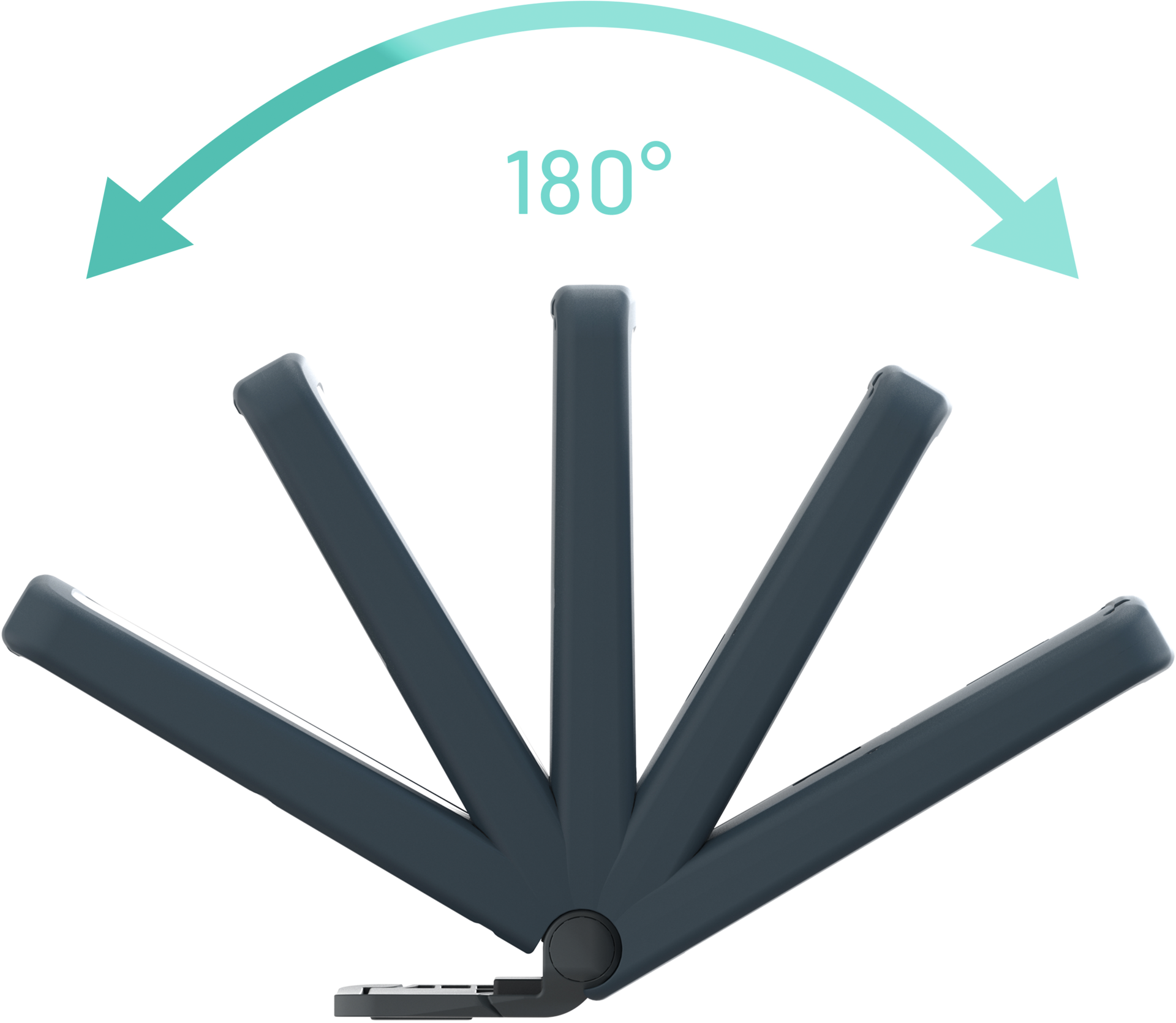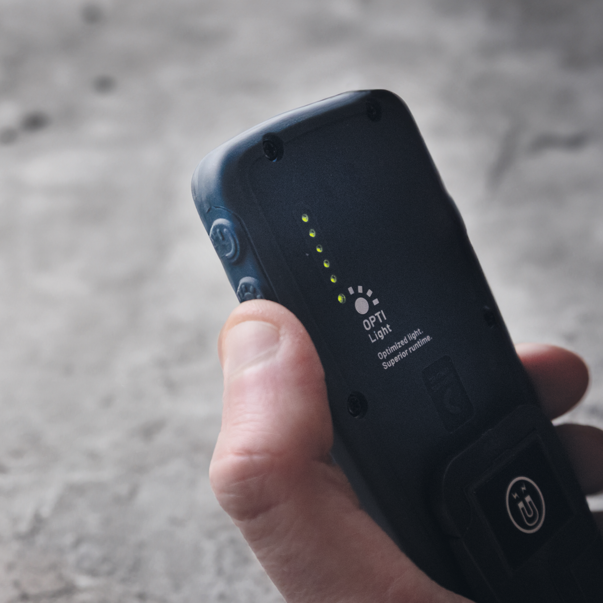 bruchfestes Gehäuse und robuster Gummioberfläche, flexibler Leuchtenkopf 180° schwenkbar, OptiLight-Funktion für optimierte Beleuchtung und Laufzeit, starker Magnet im Boden und einziehbarem Haltebügel zur Aufhängung, Dimmfunktion in 3 Stufen, mit Ladestandsanzeige