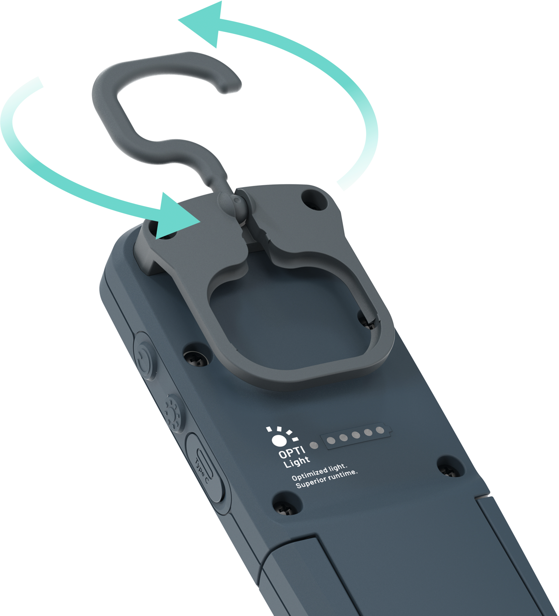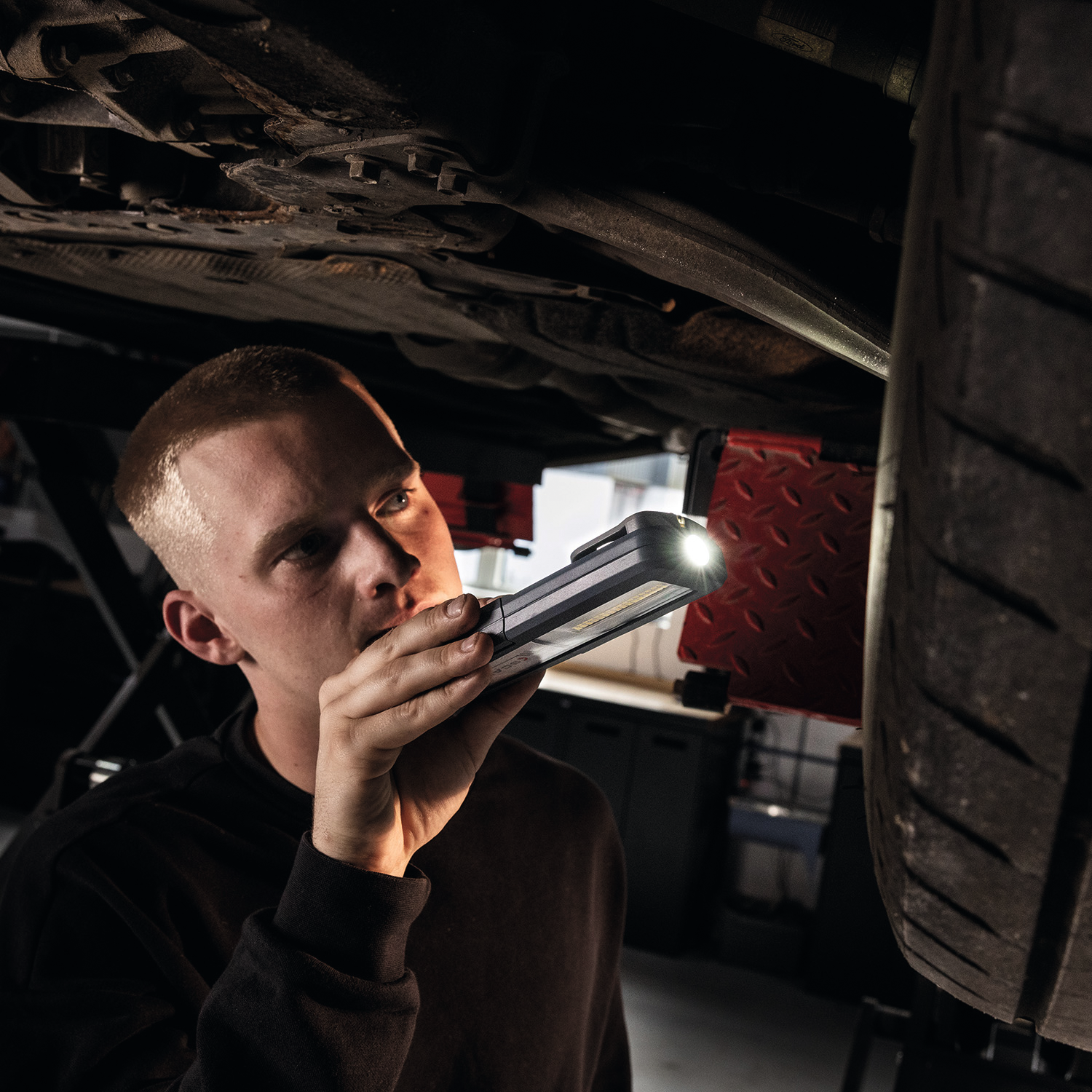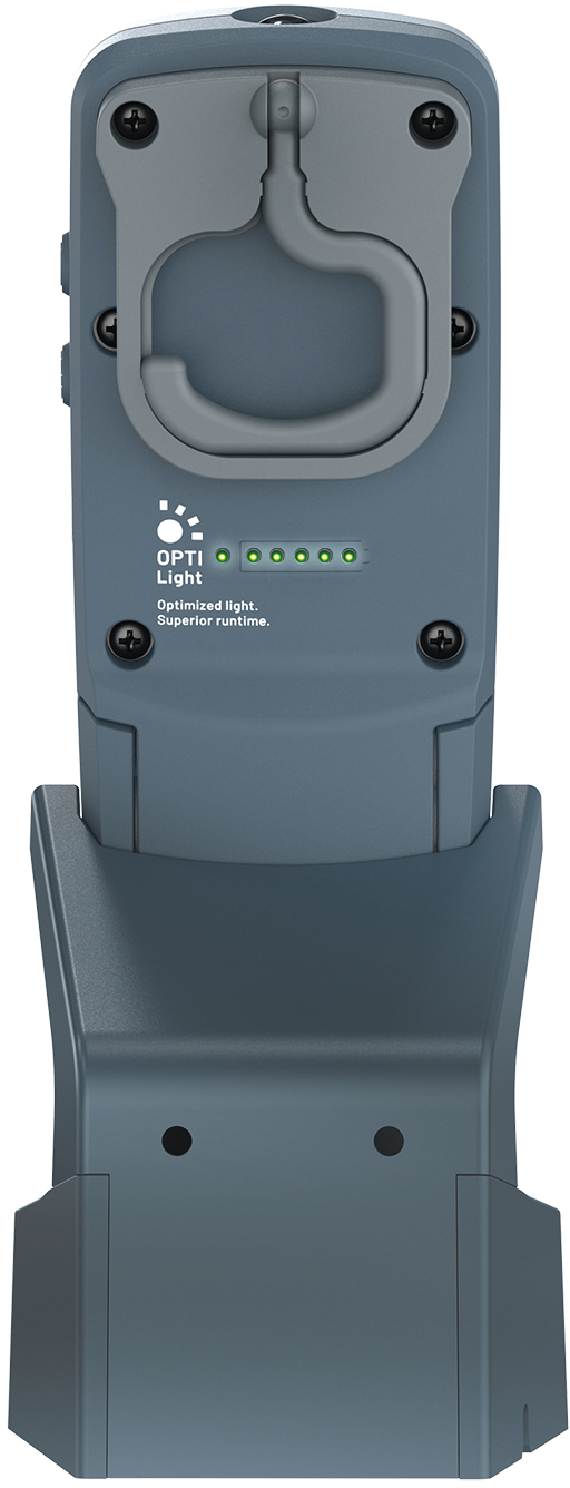 bruchfestes Gehäuse und robuster Gummioberfläche, flexibler Leuchtenkopf 180° schwenkbar, starker Magnet an der Rückseite der Arbeitslampe und zusätzlich am Boden der Ladestation zur Befestigung an der Werkbank, OptiLight-Funktion für optimierte Beleuchtung und Laufzeit, mit Magnethalter und einziehbarem Haltebügel zur Aufhängung und Befestigung am Arbeitsgürtel, Dimmfunktion in 3 Stufen, mit Ladestandsanzeige