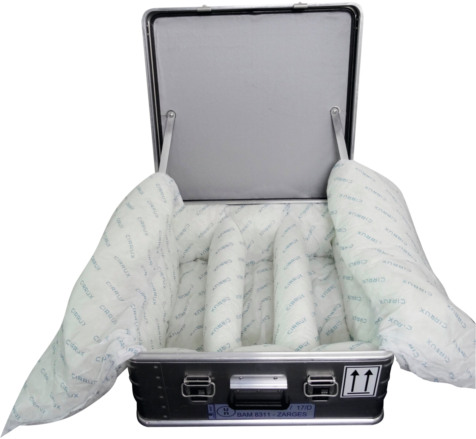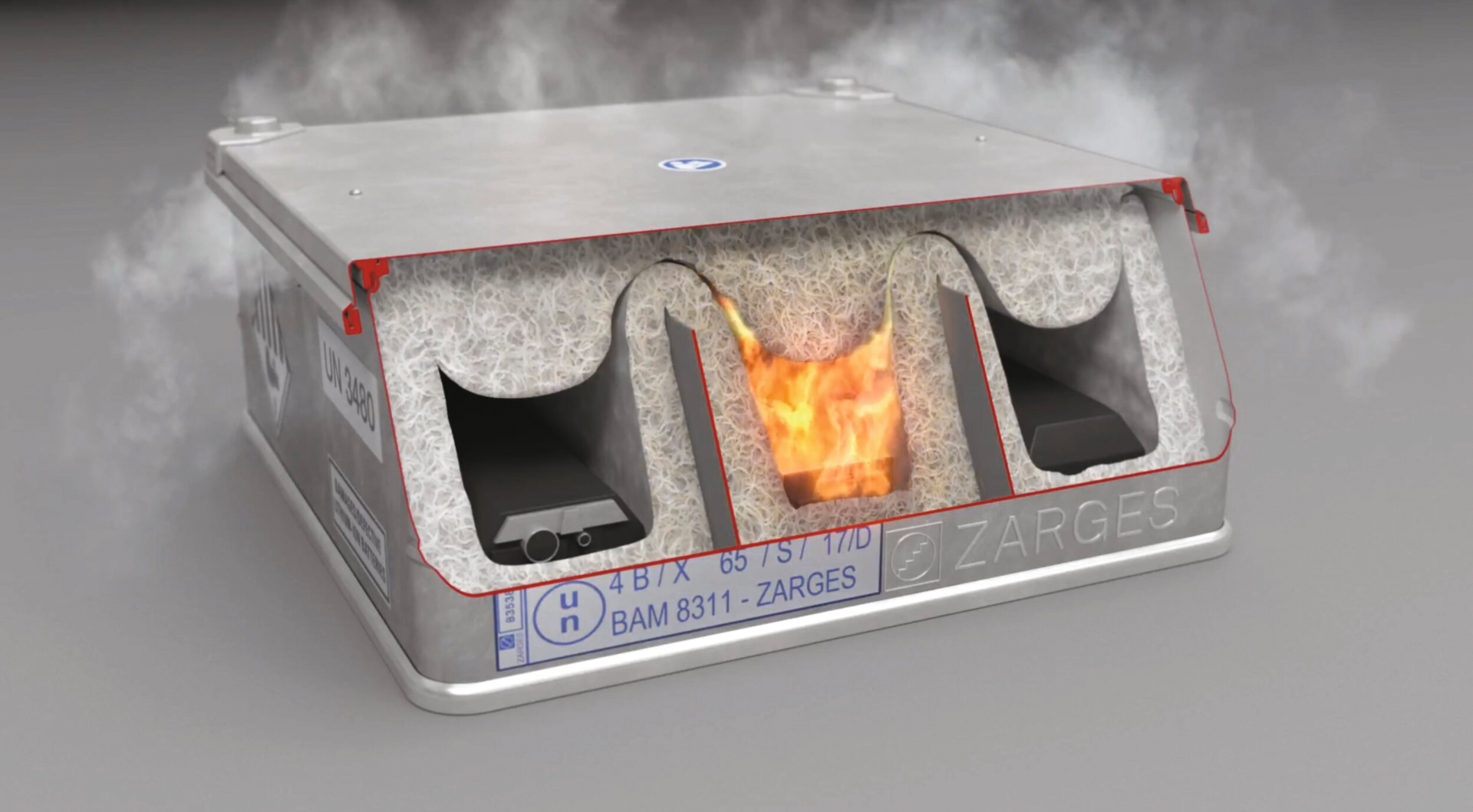 geprüfte Gefahrgutzulassung, Realbrandtest für Batterien mit Nennenergie von ca. 814 Wh bestanden, Temperatur an der Behälteroberfläche bleibt unter 100 °C, aufgrund zahlreicher Einflussparameter wie Zellchemie und Bauart, Polster- und Aufsaugmaterial nicht brennbar und staubfrei aus textuierten Glasfasern, geschäumte Deckeldichtung, 2 Federfallgriffe