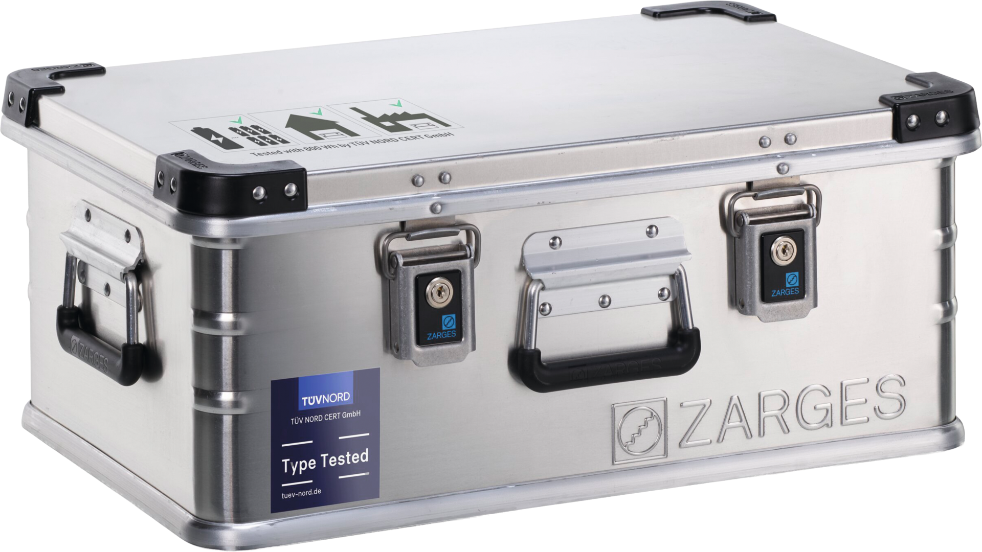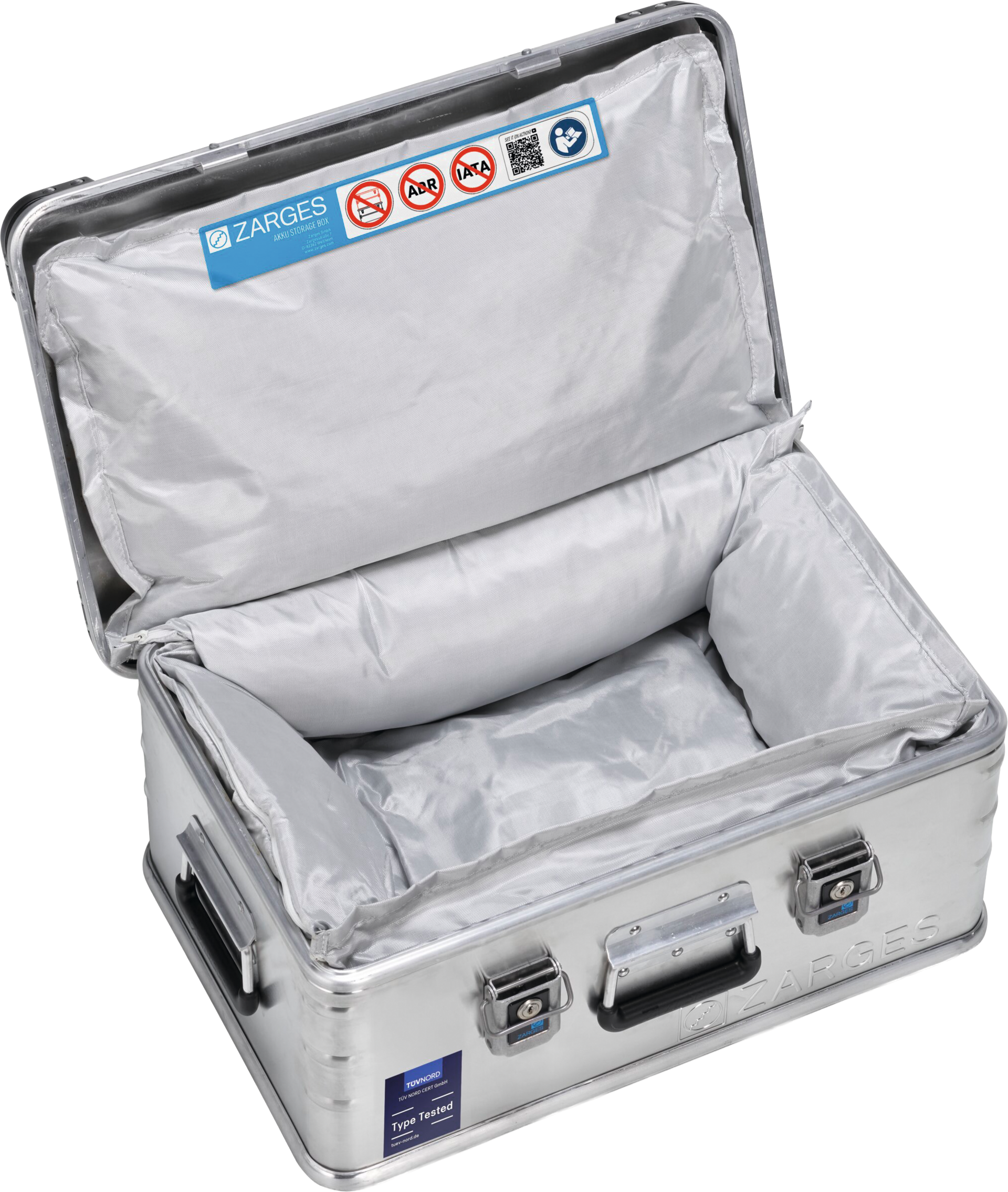 keine geprüfte Gefahrgutzulassung, Explosions- und Realbrandtest gemäß Vorgaben des TÜV NORD für Nennwerte bis 814 Wh bestanden, Temperatur an der Behälteroberfläche bleibt unter 200 °C, kein Austritt von Flammen und Splittern im Fall einer Havarie, Polster- und Aufsaugmaterial nicht brennbar, nicht elektrisch leitfähig und staubfrei, 3 Federfallgriffe