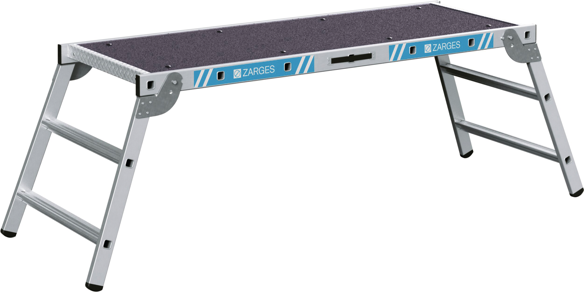 extrem rutschsicherer Plattformbelag aus PVC-Granulat auf weicher PVC-Trägerschicht nach Vorgaben der Bewertungsgruppe R13, erhöhte Sicherheit bei öligen Substanzen oder gar Eis, Sprossen-Holmverbindung durch Qualitätsbördelung