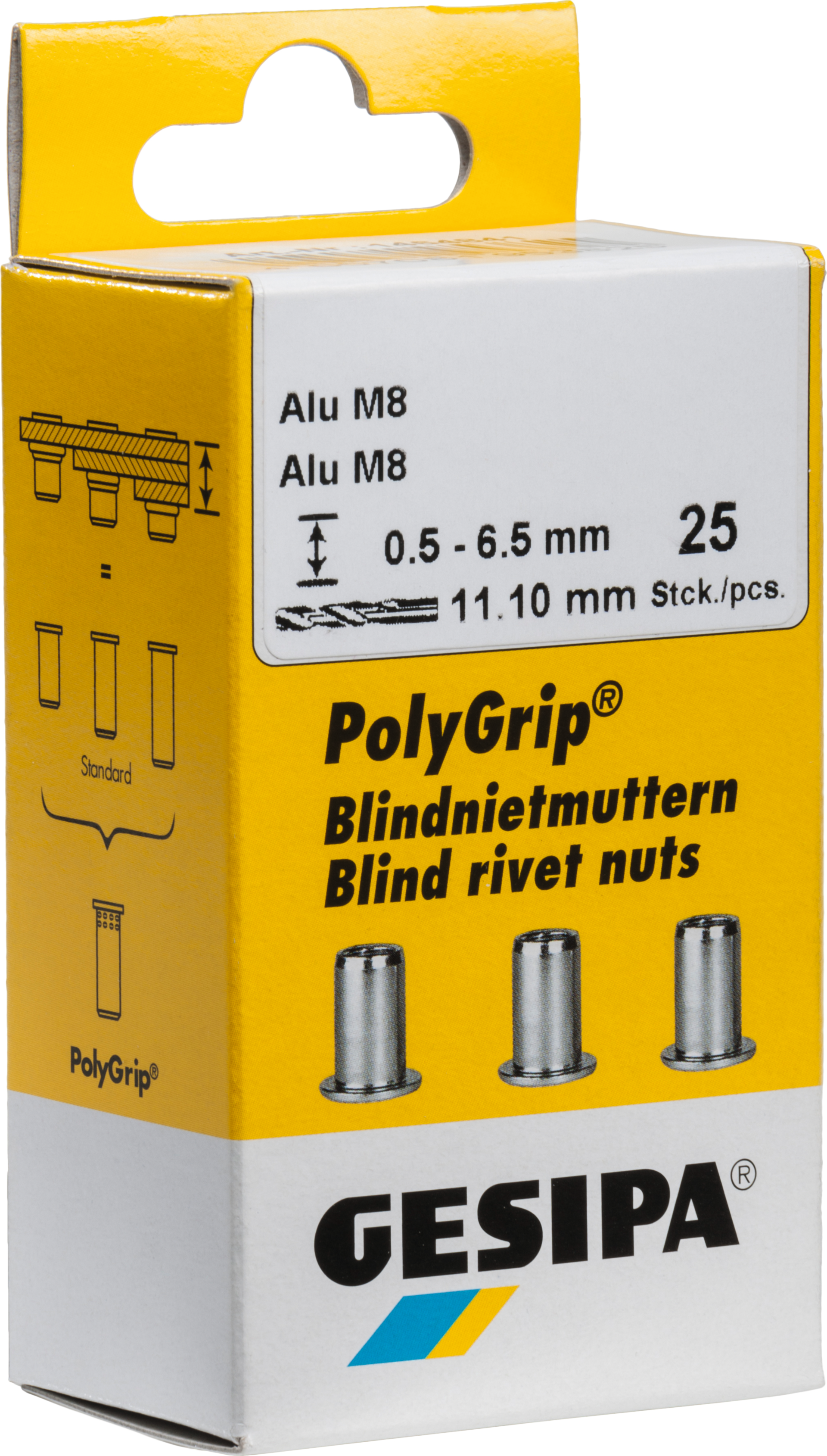 Standard (Flachrundkopf), großer Klemmbereich, eine PolyGrip®-Abmessung kann bis zu 5 verschiedene Abmessungen von DIN Standard-Blindnietmuttern ersetzen