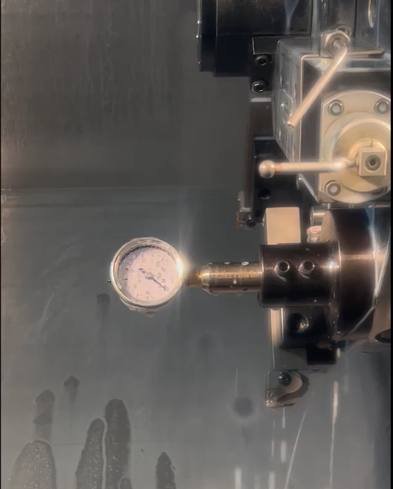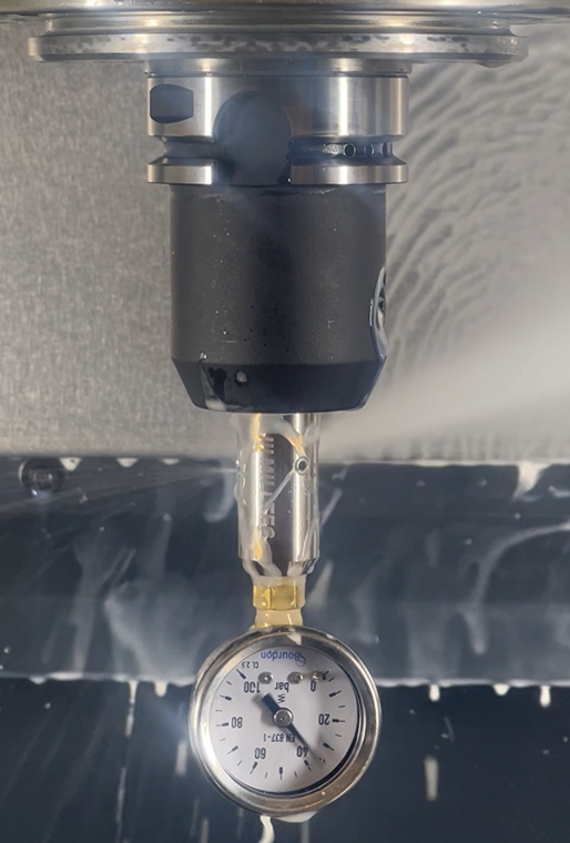 einfache und schnelle Überprüfung des Kühlschmierstoffdrucks an der Bearbeitungsspindel der Maschine bzw. Revolver der Drehmaschine bis max. 100 bar, das System wird über den Zylinderschaft Ø 20 mm in einer Weldon-Aufnahme aufgenommen und gespannt, anschließend von Hand oder über den Werkzeugwechsler in die Maschinenspindel eingesetzt, mit dem im Lieferumfang enthaltenen Gewindestiften ist es möglich die Durchflussmenge des Kühlschmierstoffs zu regulieren, durch Entfernen dieser wird eine Bohrung von 1 mm geöffnet, es ist eine Regulierung zwischen 1 mm, 2 mm und 3 mm machbar