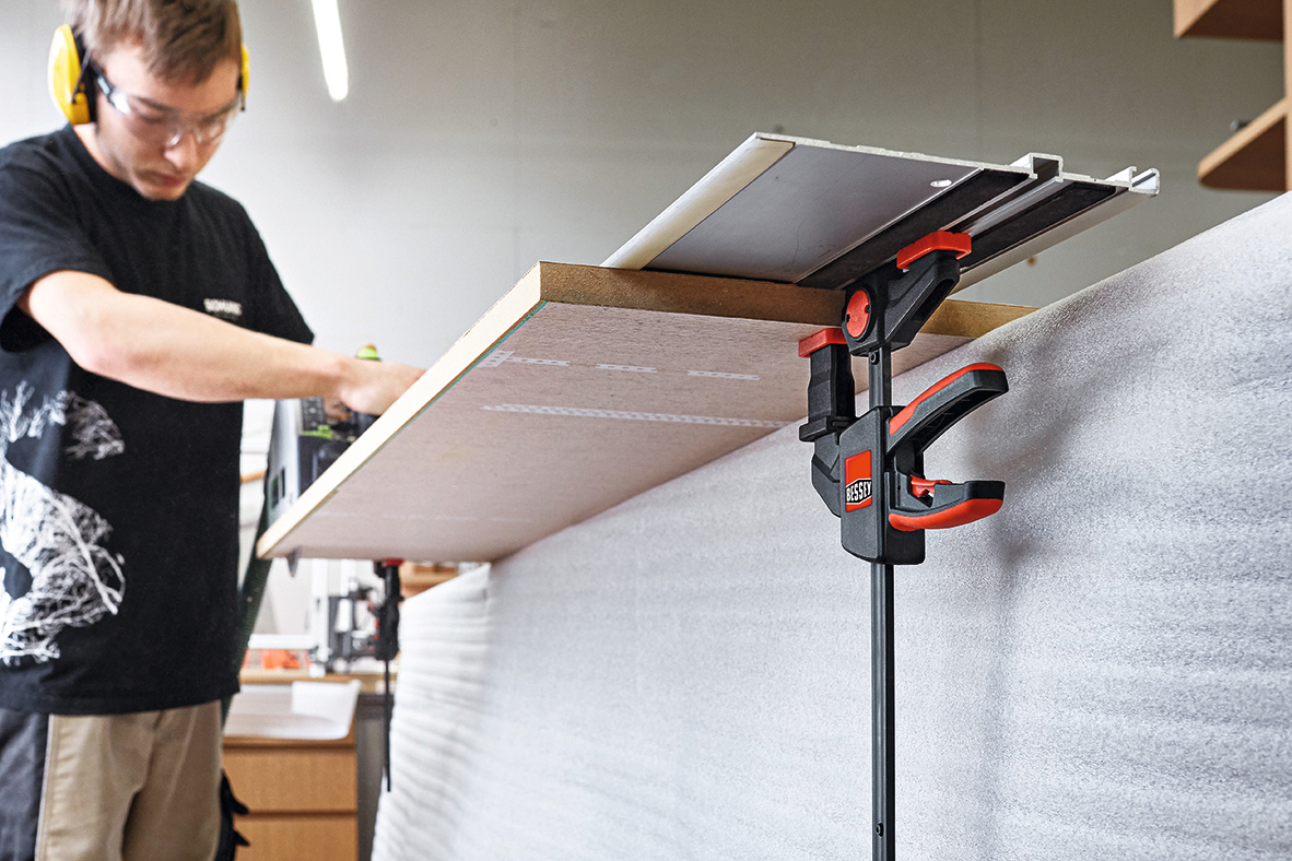 Zweikomponentengriff mit Pumphebel hinter der Schiene für sicheren Zugriff aus beiden Richtungen, integrierter Lösehebel zum schnellen Verstellen des Gleitbügels und zum Lösen der Zwinge, Kunststoff-Schutzkappen mit integriertem Kreuzprisma zum sichereren Fixieren runder, spitzer und kantiger Teile