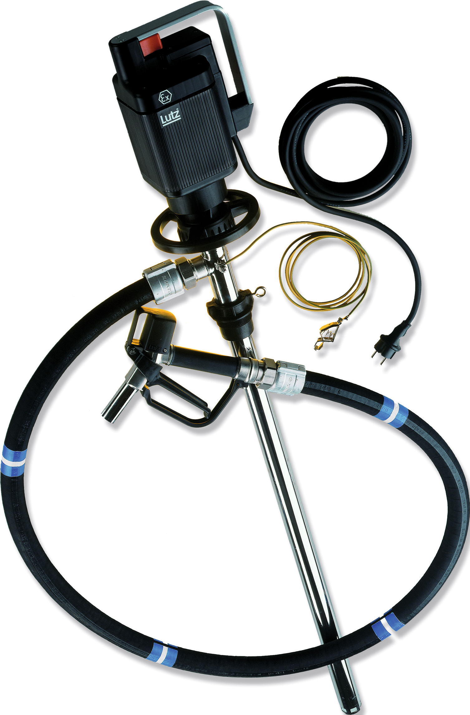Motor, Pumpwerk aus Edelstahl, 2 m Universalchemie-Schlauch 3/4" elektrisch leitfähig, eingebunden mit Schlaucheinbindung Edelstahl, Edelstahl-Zapfpistole, Potentialausgleichskabel, PP-Fassadapter (Lieferung ohne Ex-Stecker)