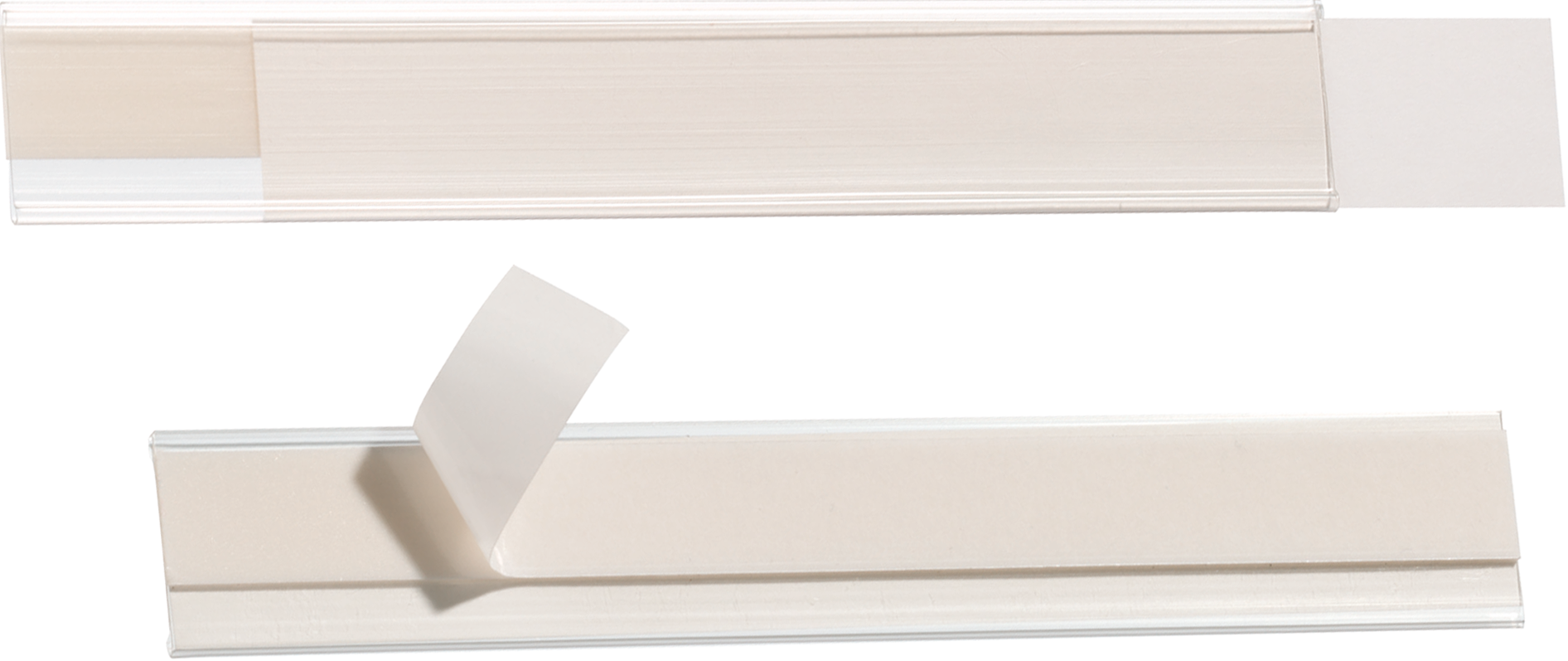 selbstklebend, variabel zuschneidbar, oben und seitlich offen, damit das EDV-beschriftbare Einsteckschild schnell ausgetauscht werden kann, mit scannerlesbarer Oberfläche