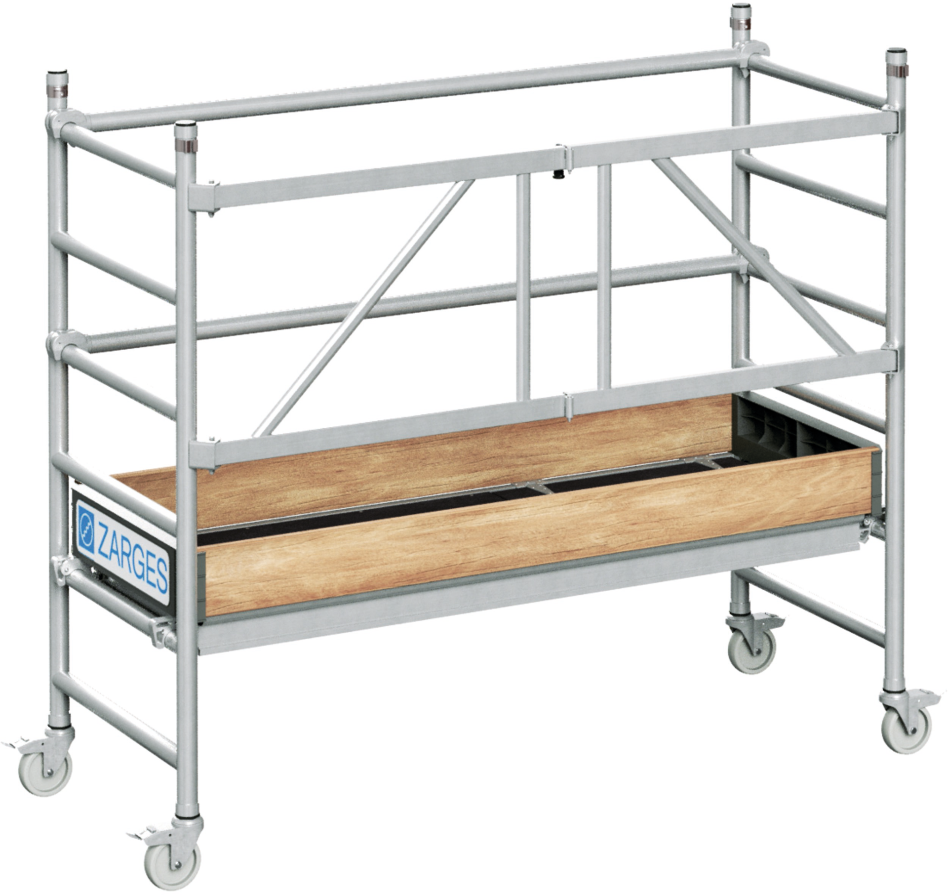 einfache Einhandbedienung des Klapprahmens mittels robustem Arretierknopf, Feststellen und Lösen mit nur einem Klick, patentierte Bordbrett-Einheit, Leichtlauf-Aufsteckführung aus Hartkunststoff verhindert ein Verkanten, sicherer und schnellerer Aufbau durch vorlaufendes Geländer und Plattformen im Abstand von 2 m, Grundeinheit türengängig, Holm- und Sprossendurchmesser 45 mm, entspricht EN 2004-1