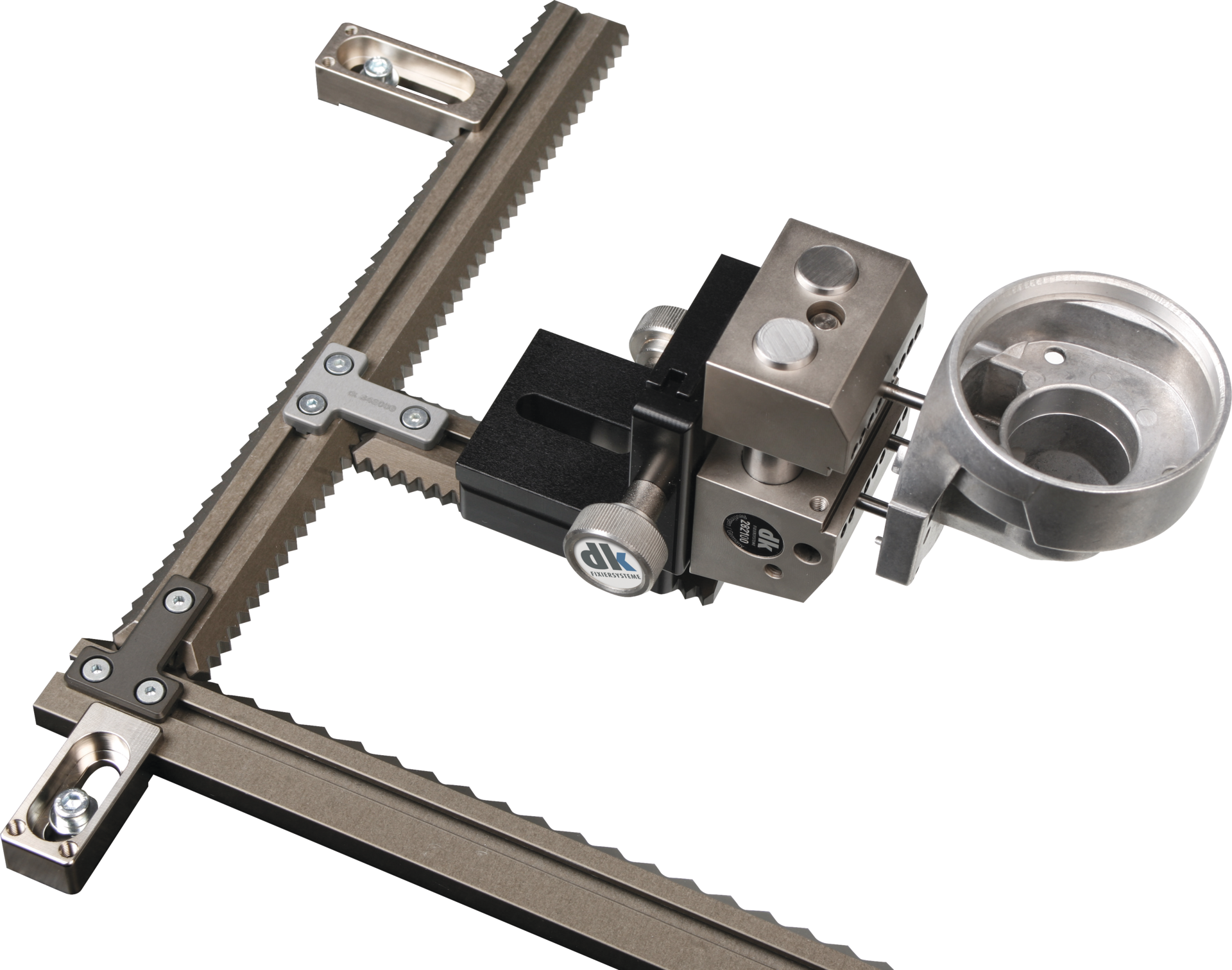 Grundschiene 250 mm, 2 Anschlussschiene 100 mm, 2 Schienen-Verbindungsstücke, 3 Aufspannpratzen 45 mm (M4-M6), je 1 Federspanner links und rechts 34 mm, je 1 Federspanner links und rechts 50 mm, 4 Aufnahmen für Federspanner 20 mm, je 3 Schrauben (M4, M5, M6)