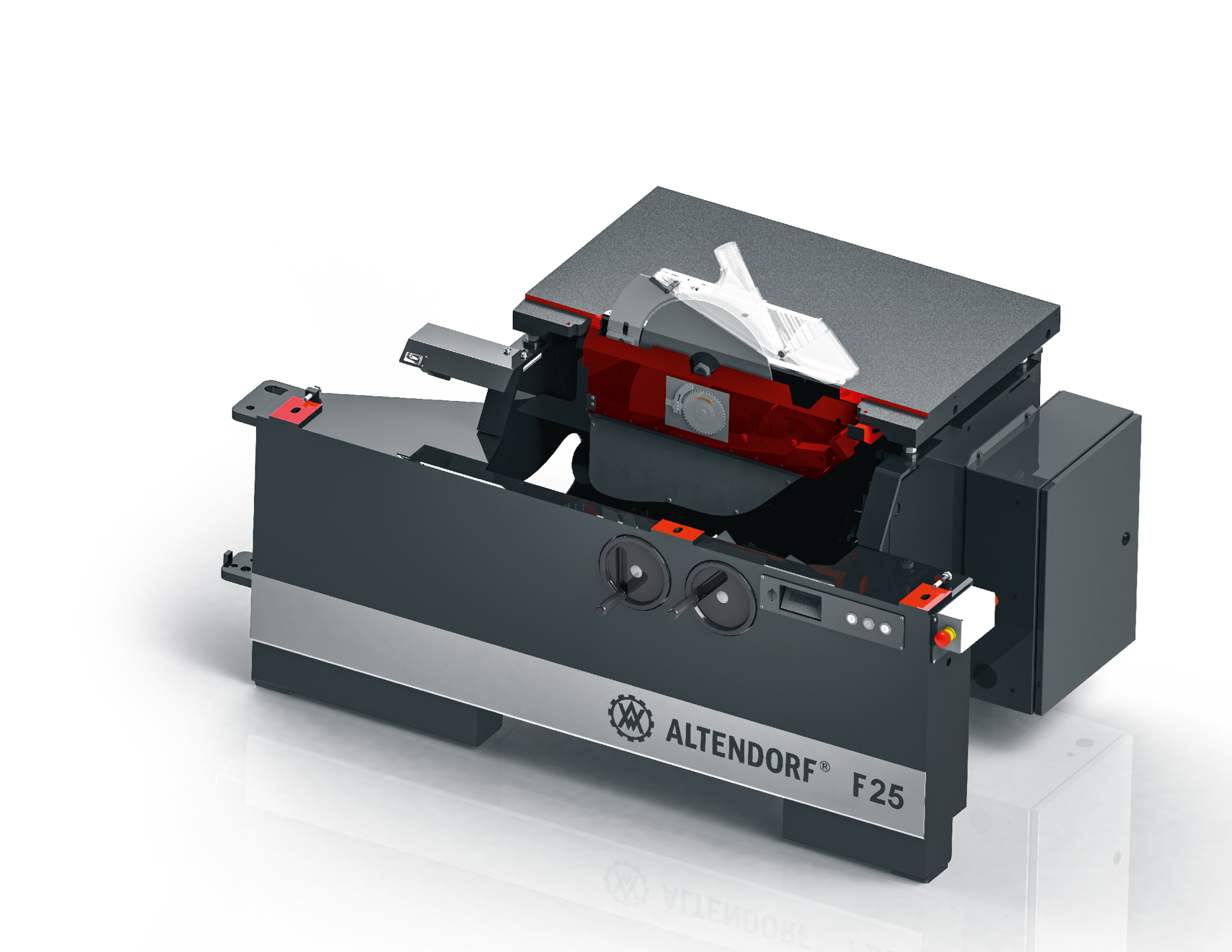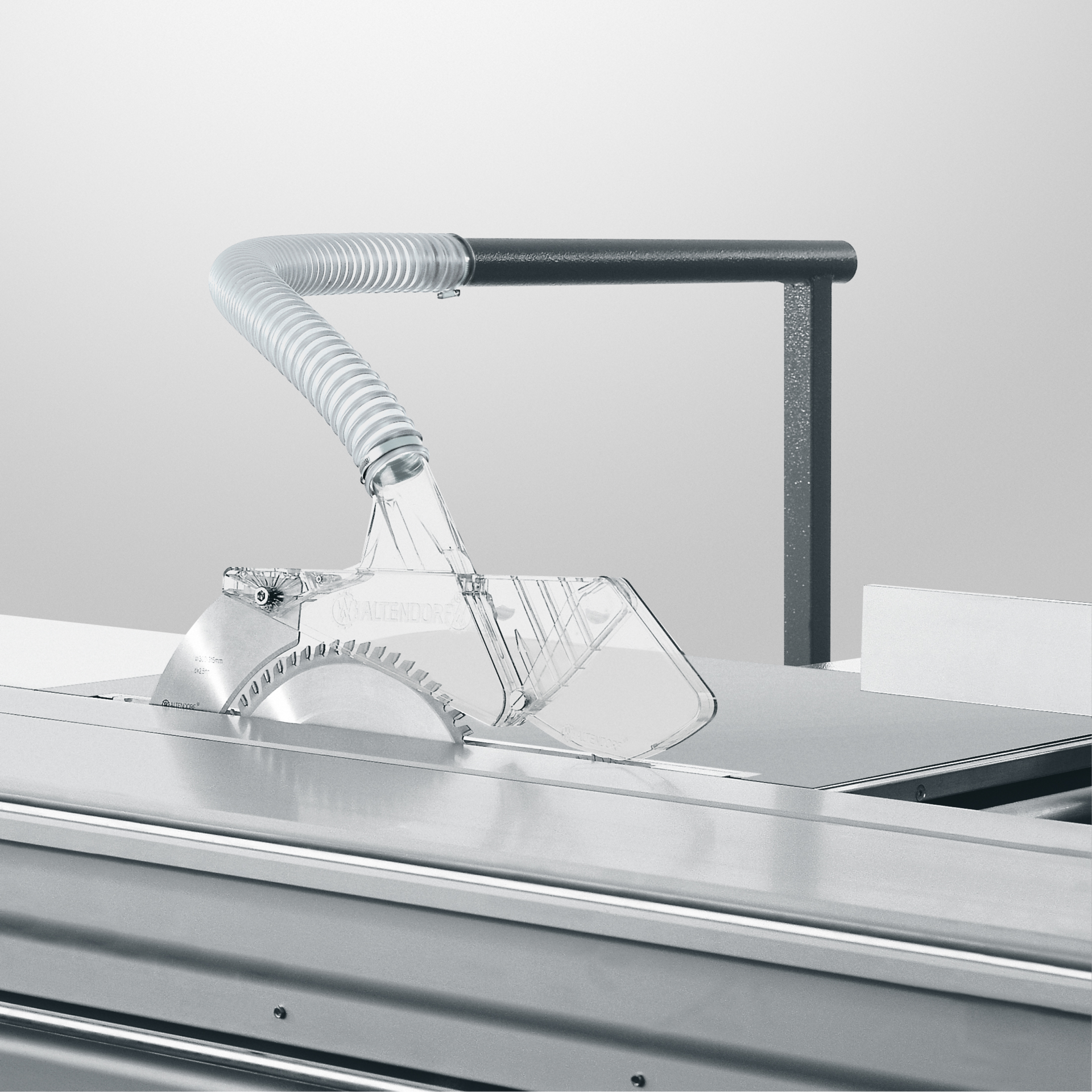 verarbeitet werden. Das einseitig schwenkbare Sägeaggreat ermöglicht zudem Winkelschnitte. Der leichtgängige Doppellrollwagen nach dem System Altendorf gehört ebenso wie die