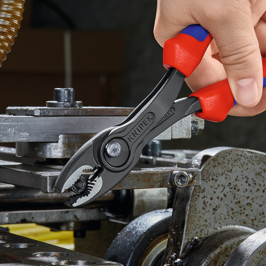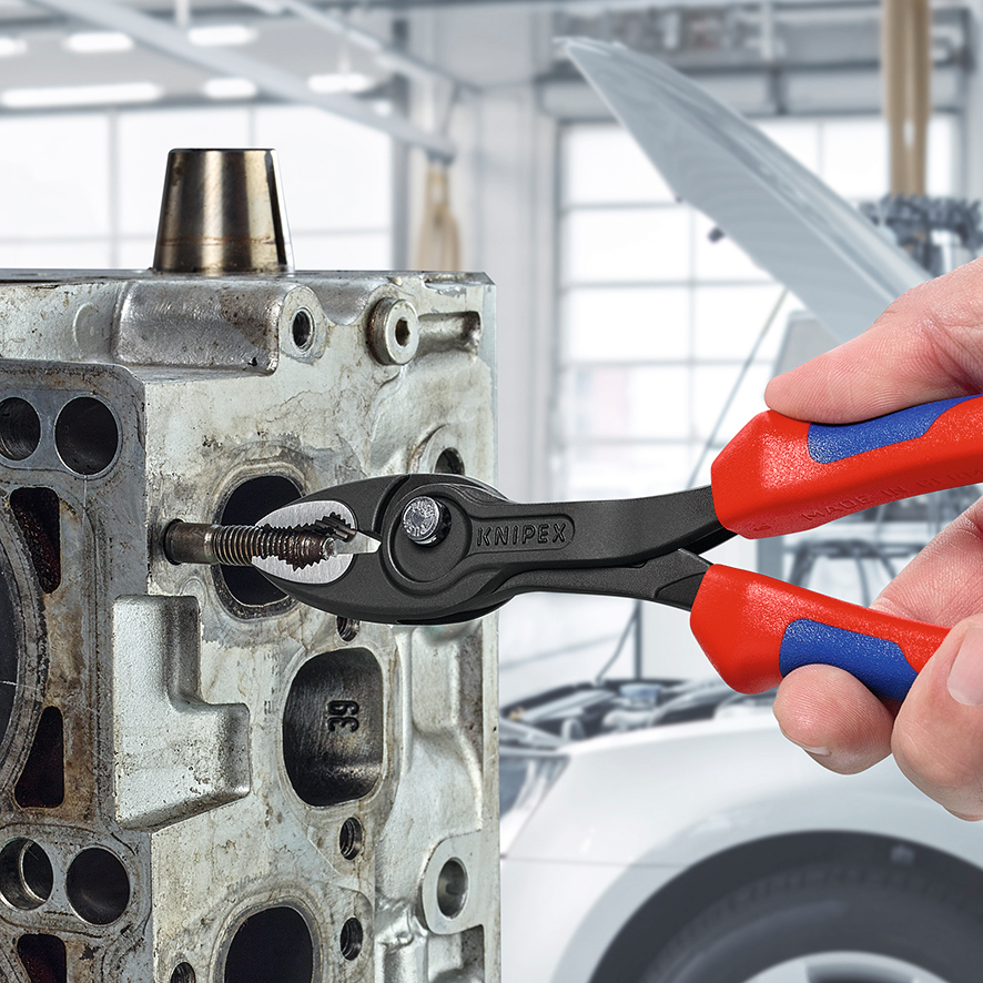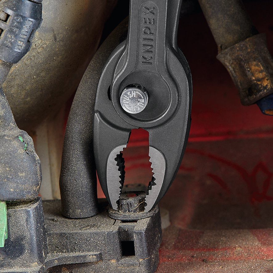 Frontgreif- und Seitengreif-Funktion in einem Produkt, die Allzweckwaffe gegen festsitzende Werkstücke wie Bolzen und Schrauben, durchgestecktes Gelenk, mit Mehrkomponenten-Griff, Druckknopfverstellung, sehr schlanke Zange, dadurch ist das Arbeiten auch in beengten Bauräumen möglich, schlanke Drehzone für schnelles Schrauben, bissiges Frontgreifmaul mit robusten Zähnen und hoher Übersetzung an der Maulspitze, frontales Greifen flacher Werkstücke durch Dreipunkt-Anlage