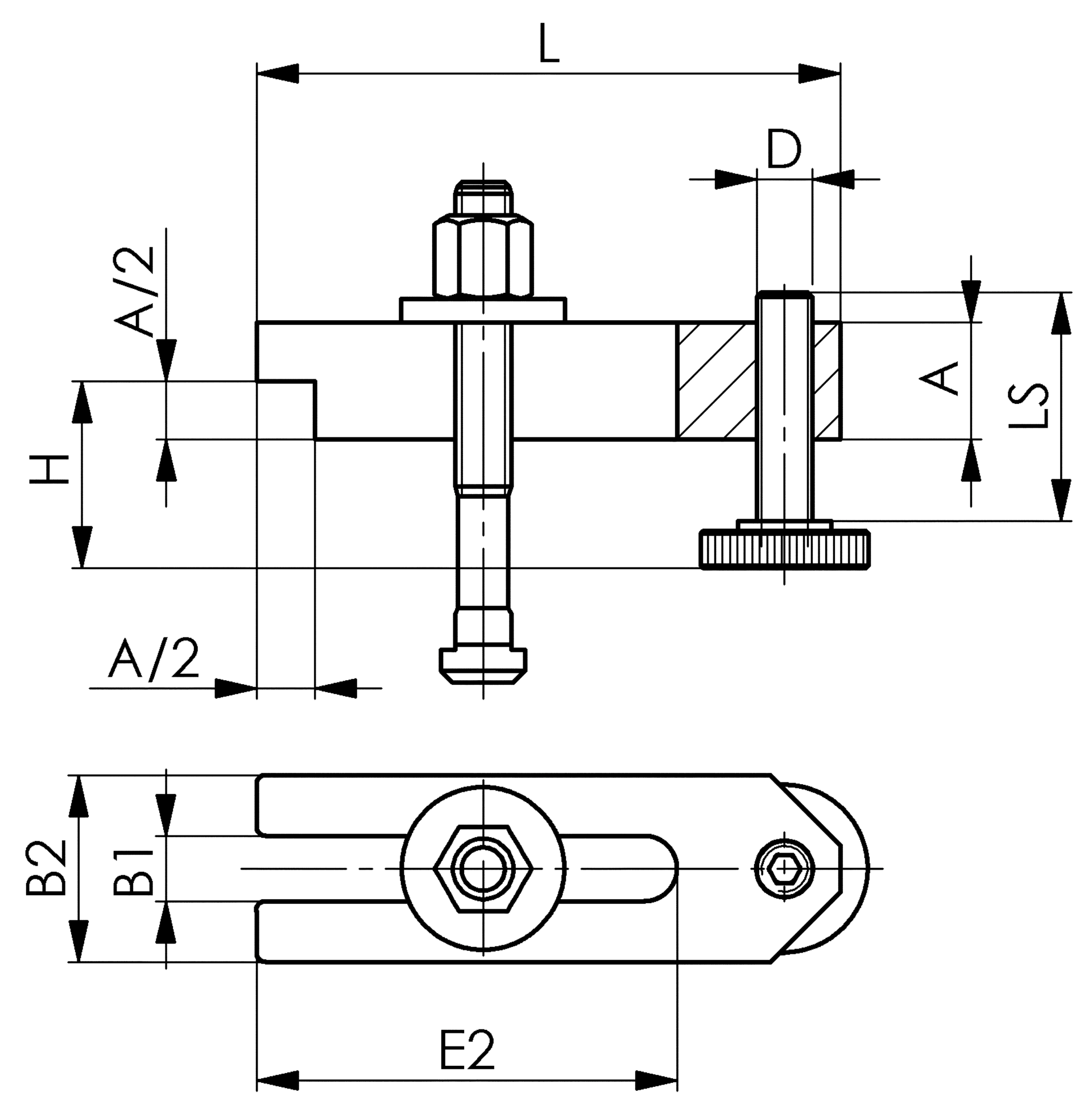 | Position | Code | D | B1 (mm) | Nut (mm) | Gewinde | H (mm) | E2 (mm) | A (mm) | B2 (mm) | L (mm) | LS (mm) | Spannschraube (mm) | Anzahl | VE | Preis/VE | |||
