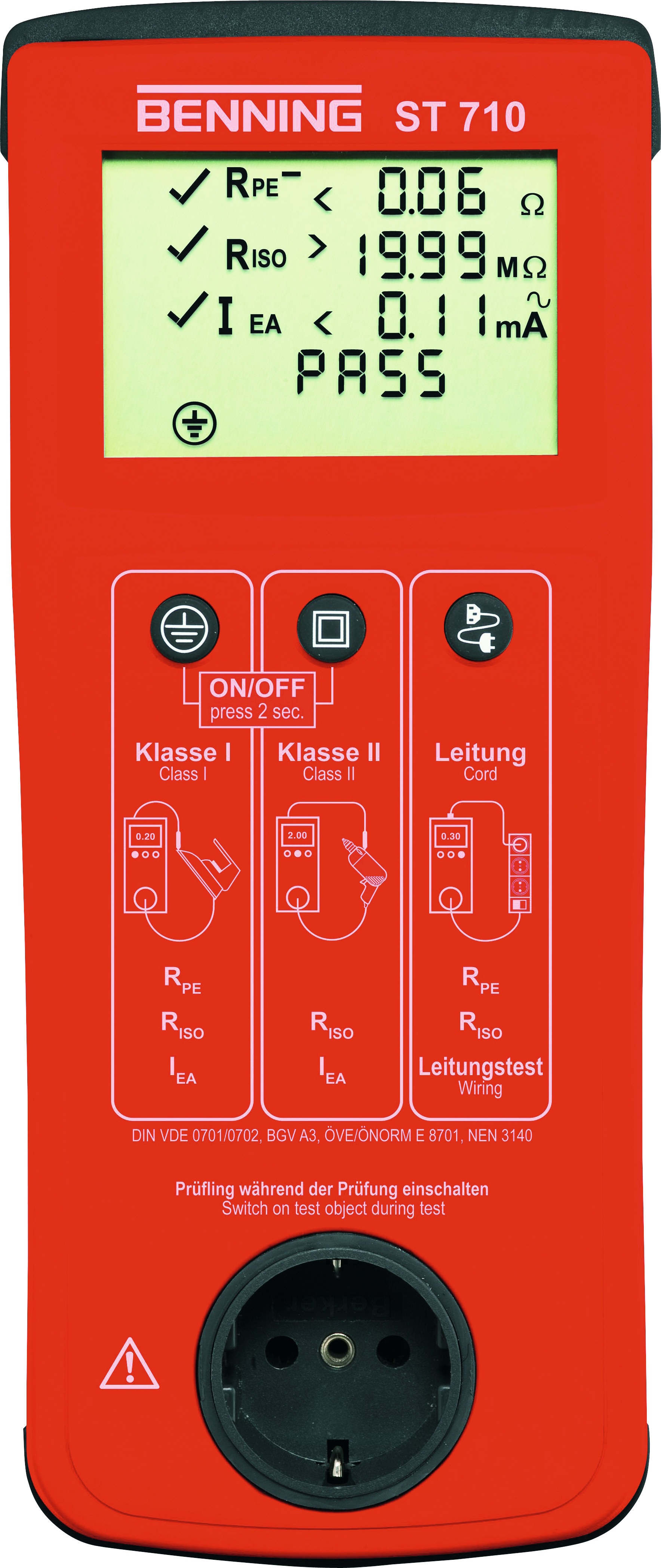 | Sicherheit: | DIN VDE 0701-0702 (EN 62638), DGUV Vorschrift 3, BetrSichV, ÖVE/ÖNORM E 8701 und NEN 3140 |
