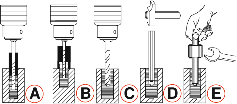 E: Ausdrehmutter bis unten auf den Stift schieben, gleichmäßig, ohne zu verkanten, den abgebrochenen Gewindebolzen ausdrehen