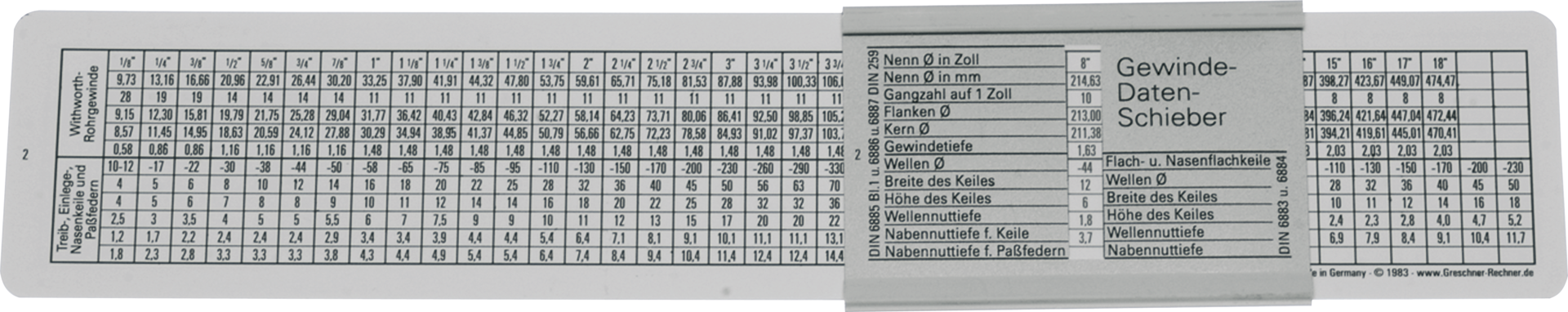 Vorderseite: metrisches Gewinde und metrisches ISO-Gewinde, Whitworth-Gewinde, Rückseite: Whitworth-Rohrgewinde, Treib-, Einlege-, Nasenkeile und Passfedern