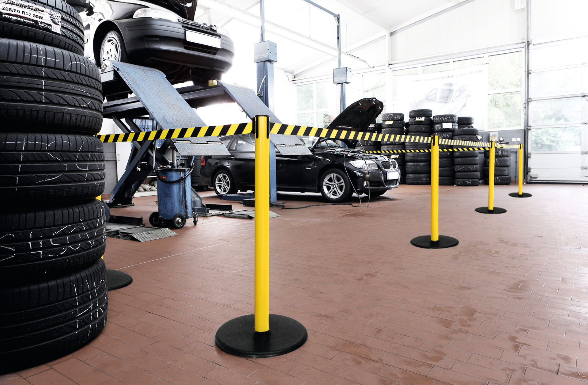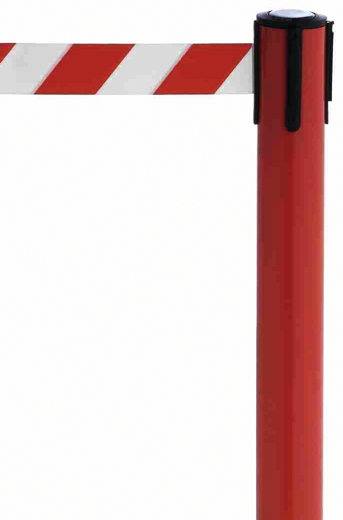 mit Gurtband 4 m lang und 50 mm breit, Bodenteller aus Guss mit schwarzer Kunststoffabdeckung, Fuß-Durchmesser 350 mm, weitere Pfosten- und Gurtfarben auf Anfrage lieferbar