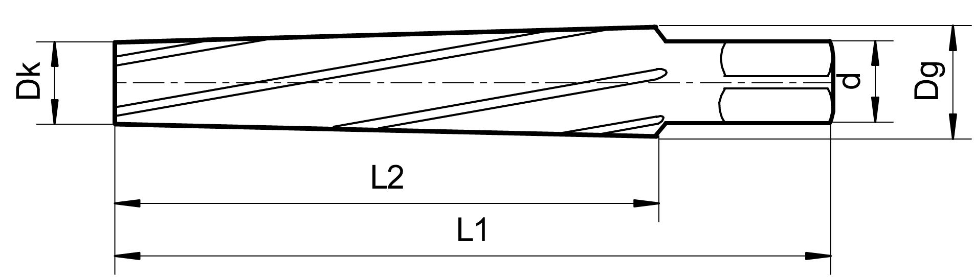 | Einsatz: | zum Reiben von konischen Bohrungen, in allen Eisen-, NE-Metallen, Kunststoffen und für Bohrungen mit unterbrochenem Schnitt |