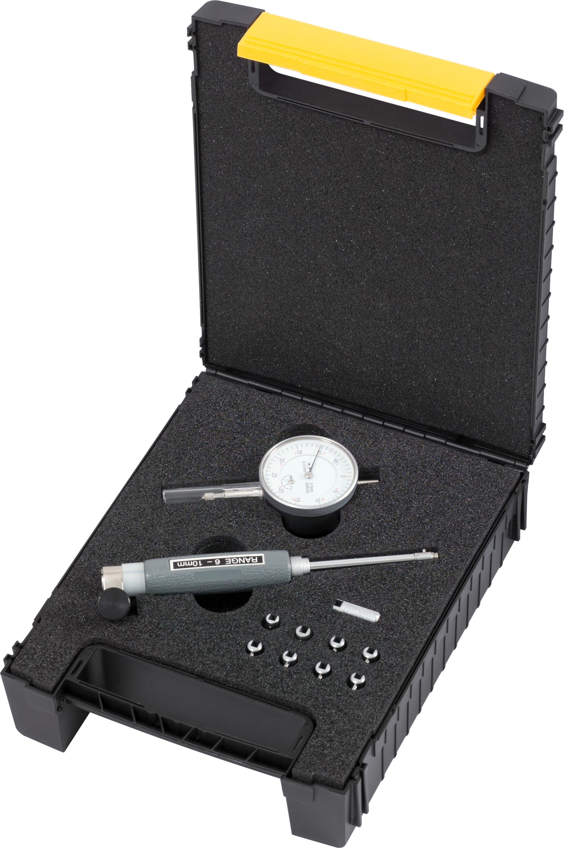 Einzelgerät, 1 Satz feste, wechselbare Messanschläge zur Abdeckung des Messbereiches, 1 analoge Messuhr und Etui