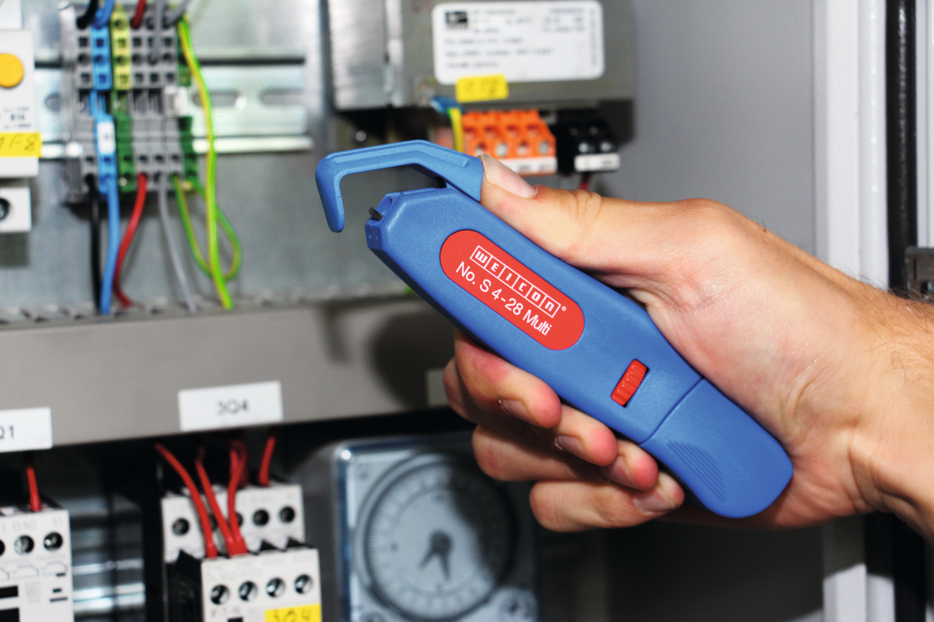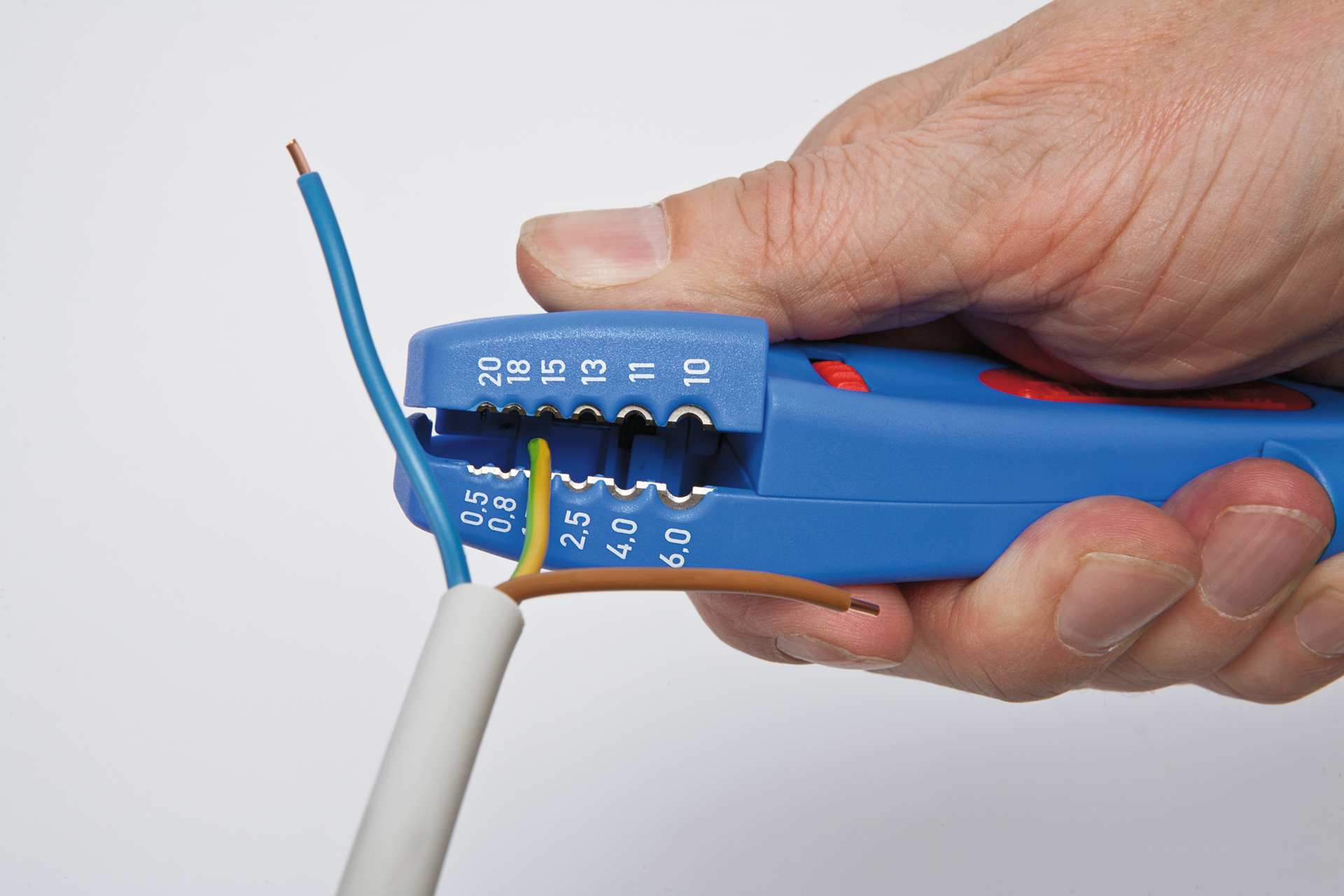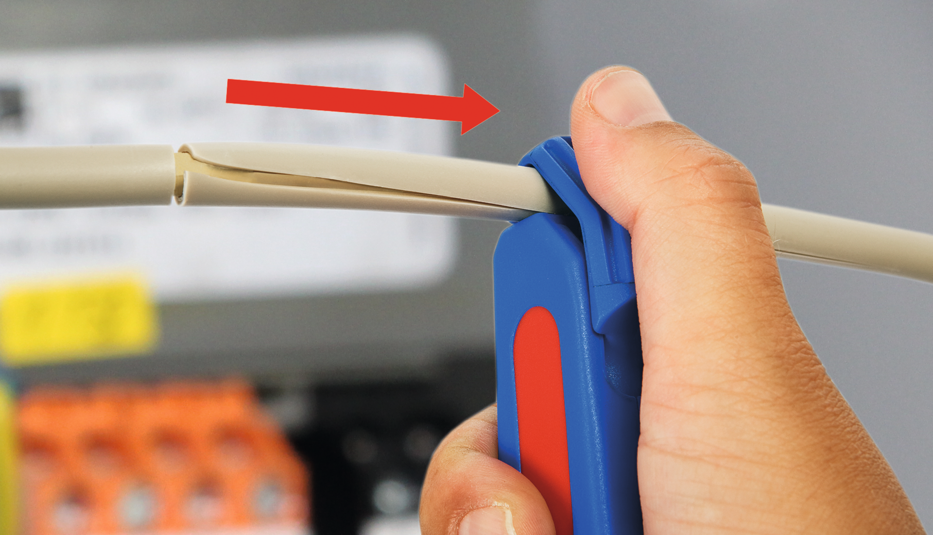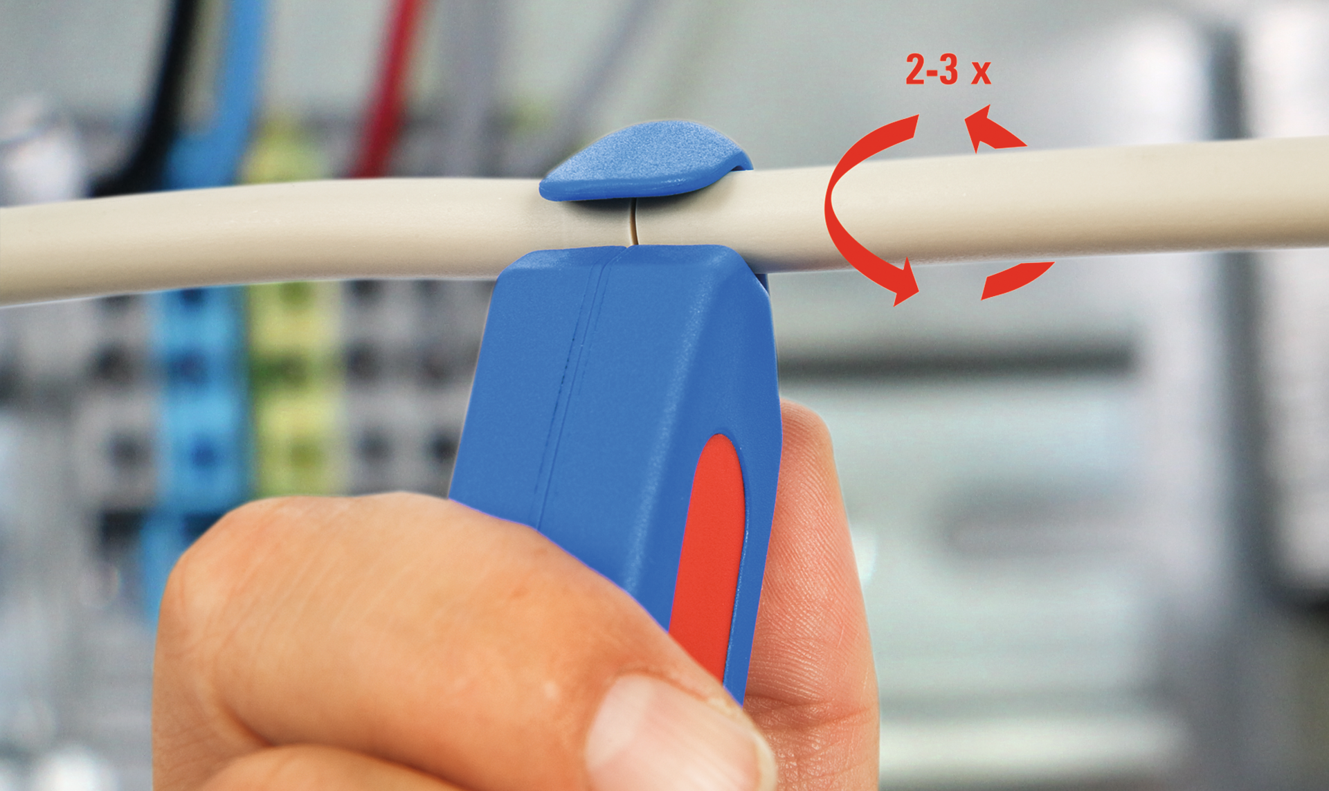 präzises, schnelles und sicheres Abmanteln aller gängigen Rundkabel von Ø 4-28 mm, stufenlose Einstellung der Schnitttiefe mittels Verstellrad, automatische Umstellung von Rund- auf Längsschnitt durch selbstdrehendes Schneidmesser