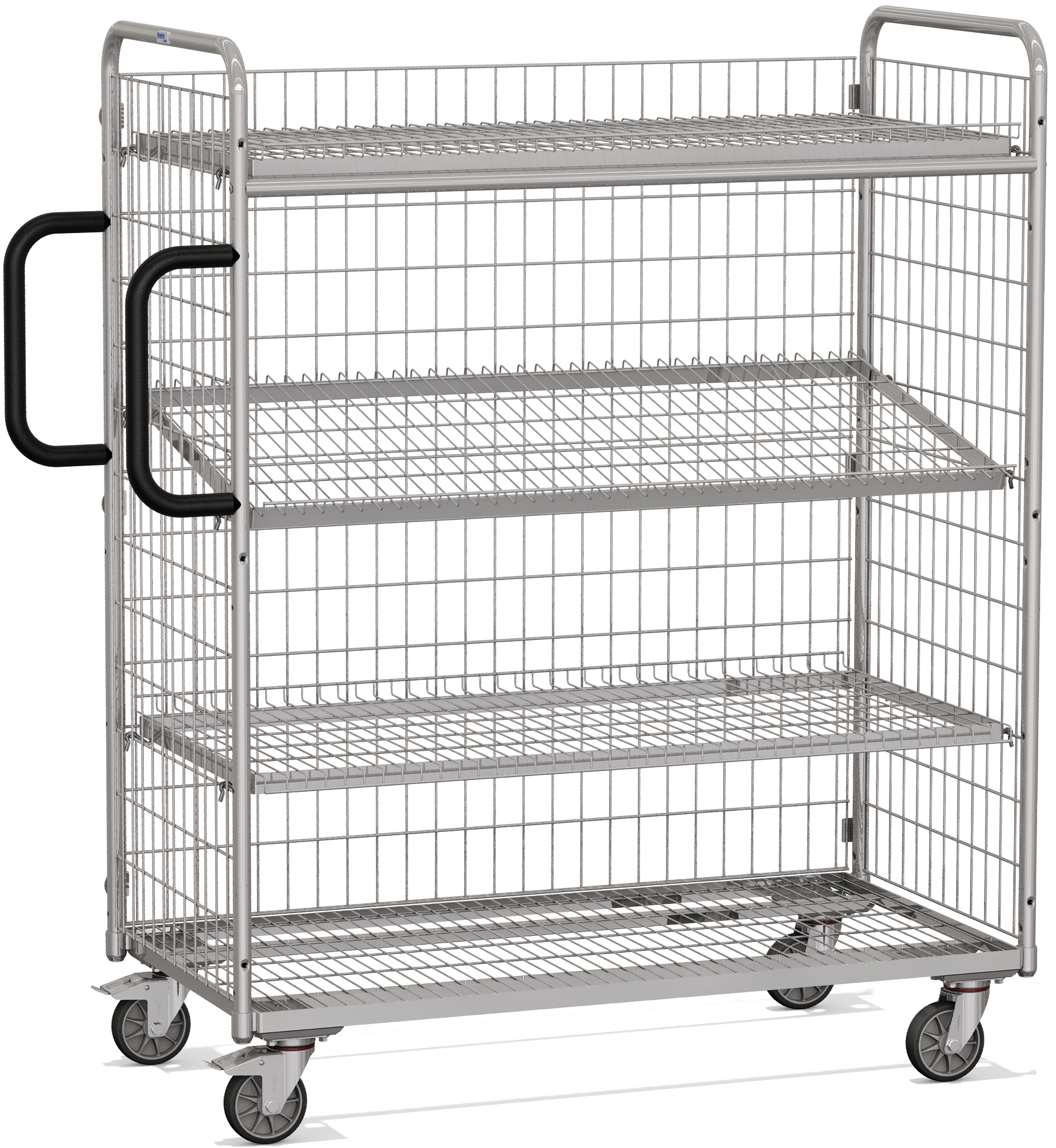 Profilstahl-/Stahlrohrkonstruktion, Stirnwände und Etagenböden aus Drahtschweißgitter galvanisch verzinkt, Maschenweite Stirnwände 100 mm x 50 mm, Maschenweite Etagenböden 120 mm x 30 mm, Etagenböden längsseits einmal nach oben und einmal nach unten 23 mm abgekantet, im Raster von 100 mm waagerecht oder geneigt einhängbar, 2 Rohrschiebegriffe anschraubbar, 4 Leichtlauflenkrollen, 2 davon mit Feststeller, Einlegeböden mit 80 kg Tragkraft