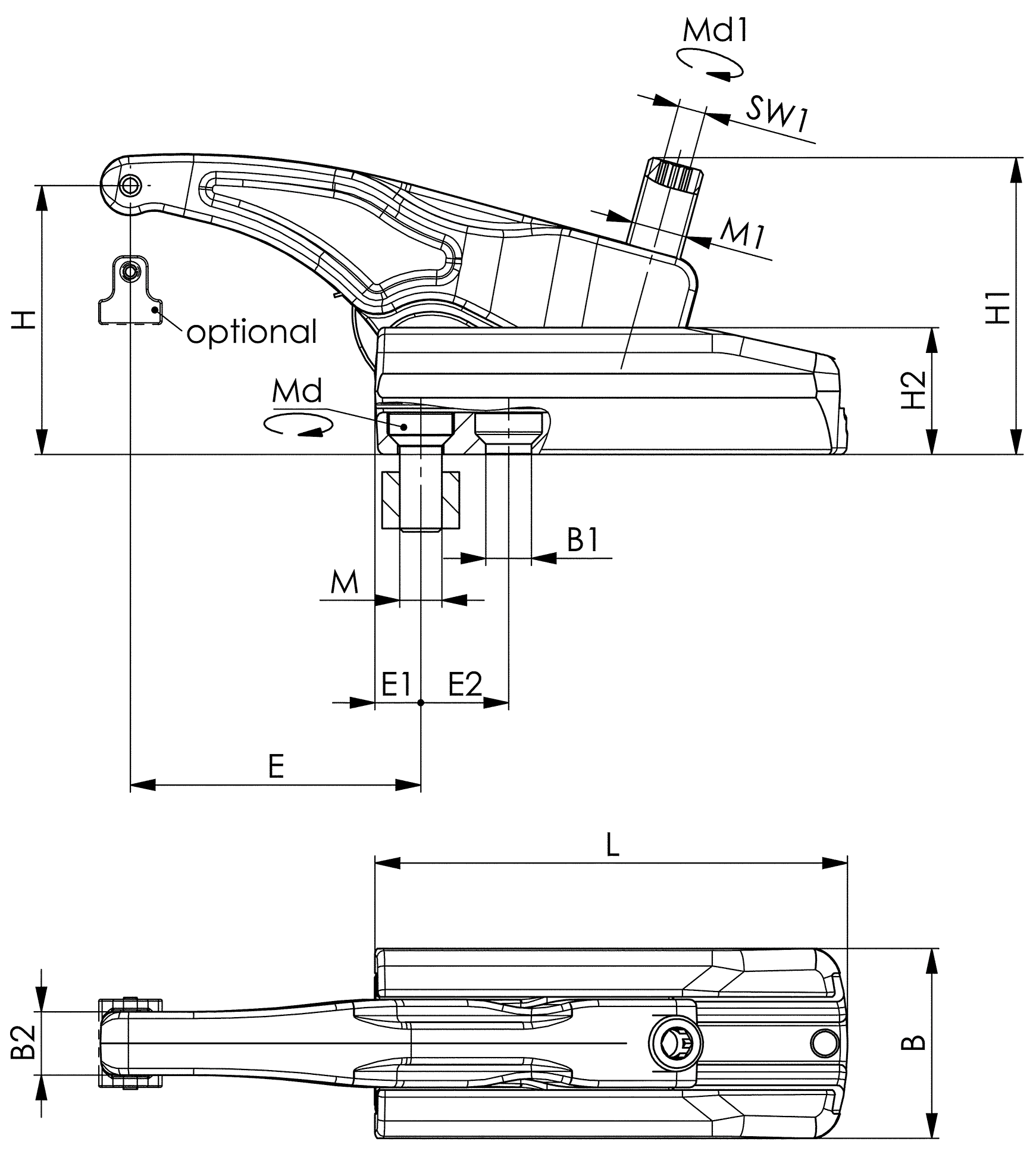 | Einsatz: | 1. Trägerelement auf dem Werkzeugtisch positionieren und mit vorgegebenem Anziehdrehmoment Md befestigen. 2. Den Spannarm in die gewünschte Position bringen. 3. Durch das Betätigen der Verstellschraube wird das Werkstück gespannt. |