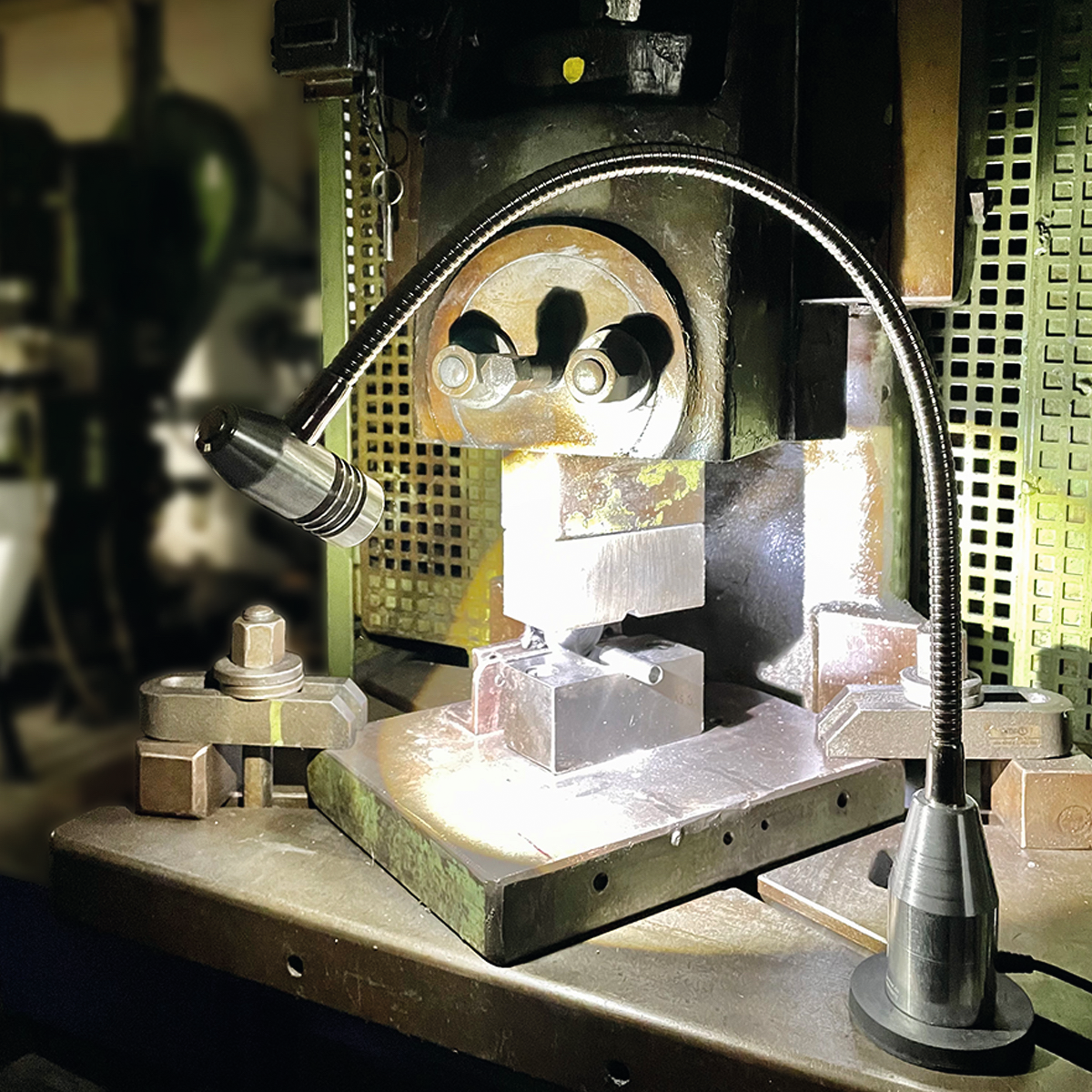 dimmbar, flexibler Leuchtenarm, Hochleistungs-LED im Aluminium-Gehäuse, gummiummantelter Magnetfuß, Leuchtenkopf 90° abgewinkelt, Abstrahlwinkel 75°, blend- und flackerfrei, reflexionsarm, flexible Anbringung an Maschine oder Arbeitsplatz