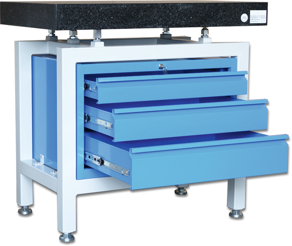 hochfest und äußerst homogen und feinporig, geringe thermische Ausdehnung, korrosionsfrei und von hoher mechanischer Festigkeit, Messflächen diamantgeläppt, Außenkanten sichtgeschliffen, Rückseite feingesägt, Schrankunterbau aus stabilem Vierkantrohr mit Modul aus 3 Schubladen, mit Lagergarnitur und Kippschutz, Standfüße höhenverstellbar