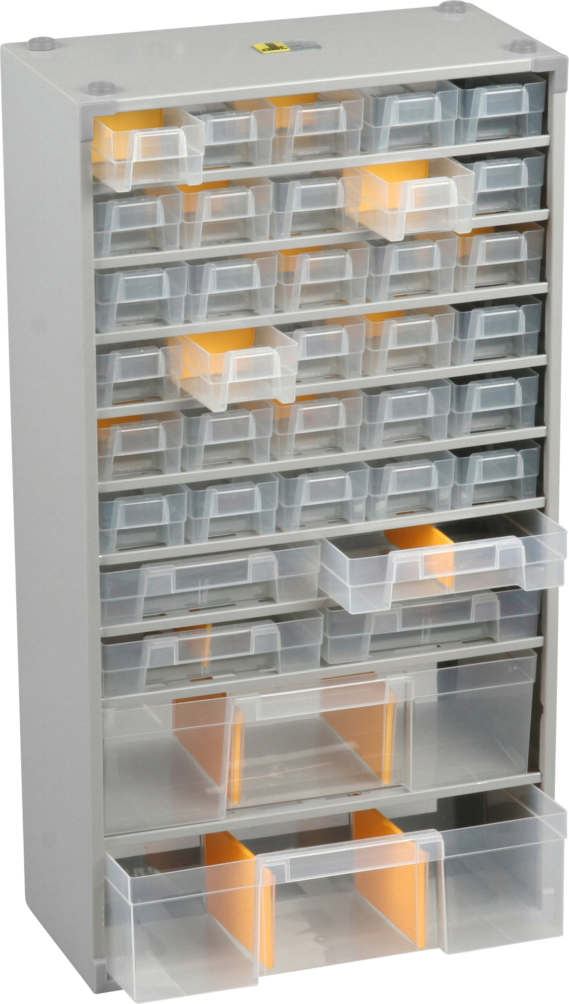 schwere Industriequalität zur Unterbringung von kleinen und größeren Teilen, mit Aufhängepunkten für Wandbefestigung oder Stapelung durch Sicken, Schubladen aus transparentem Polypropylen