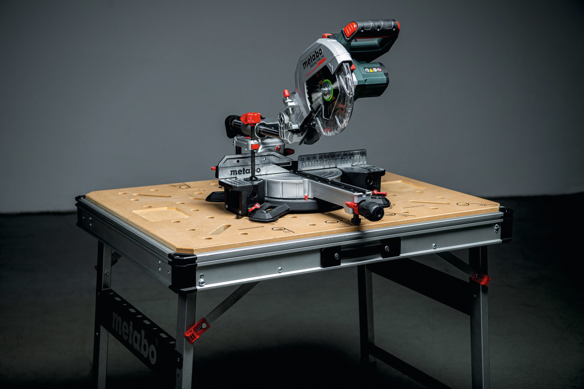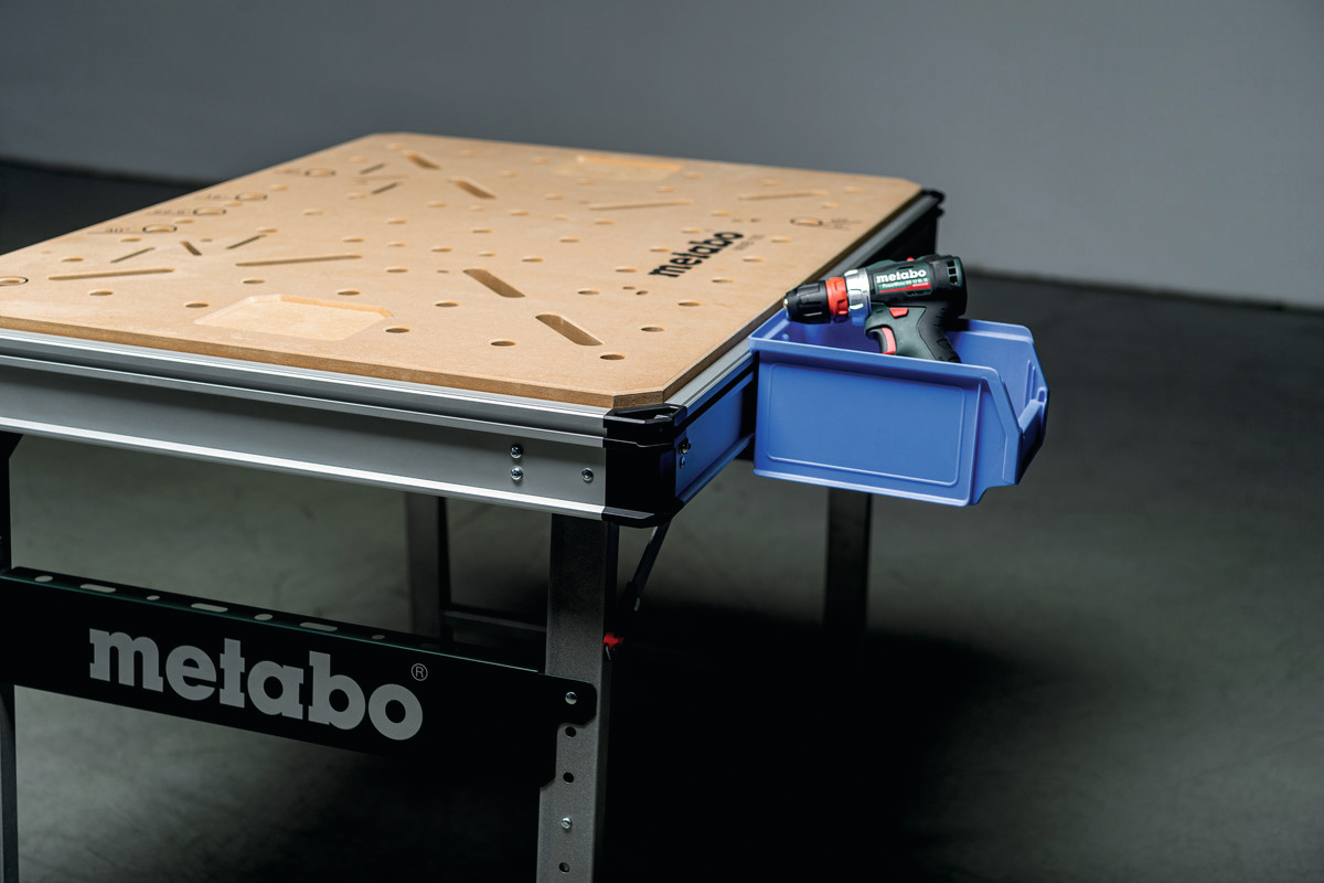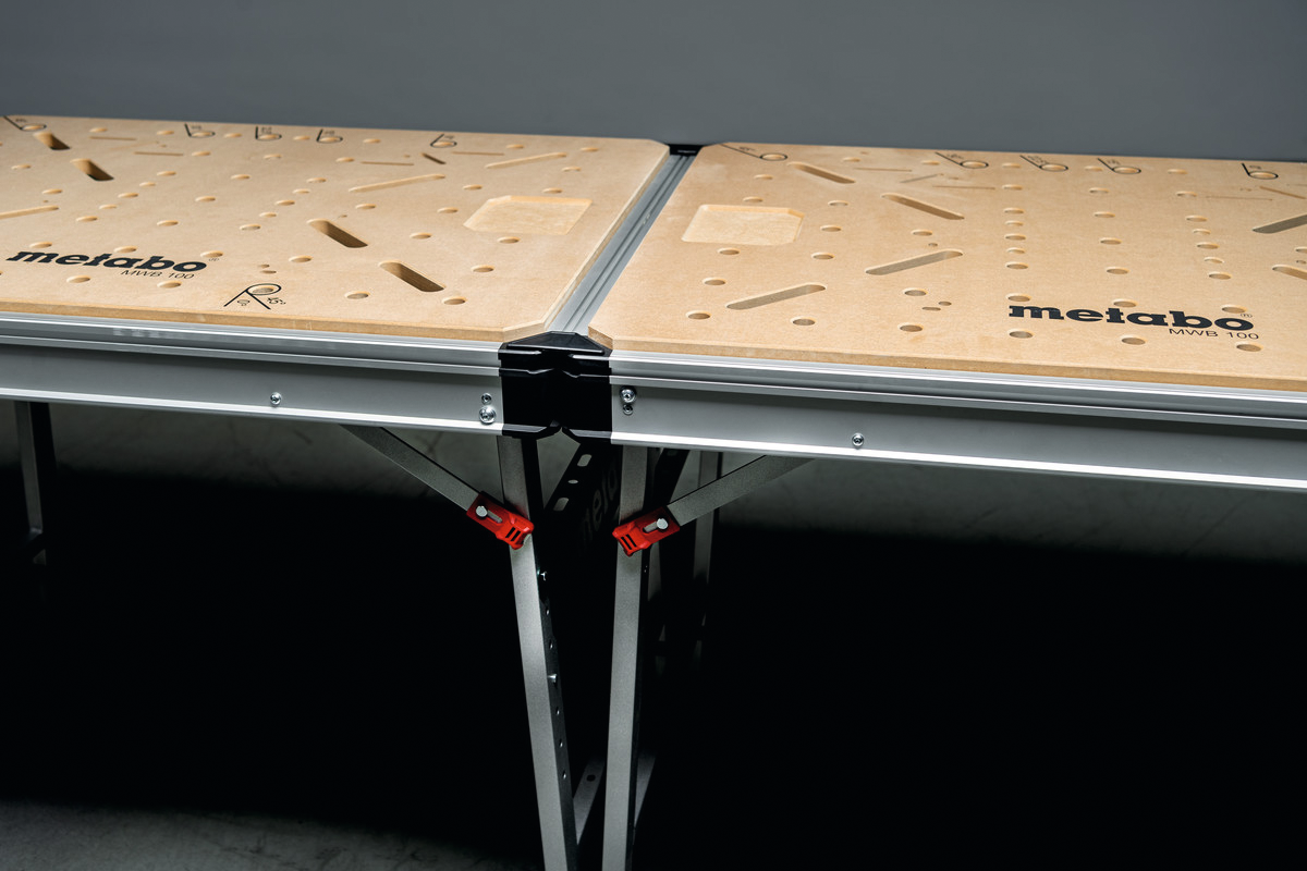 mobile Werkbank mit vielen Einsatzmöglichkeiten, schneller Auf- und Abbau dank Klappmechanismus, höhenverstellbare Standbeine für eine optimale Arbeitshöhe, Nivellierfuß zum Ausgleich unebener Untergründe, umlaufende T-Nut für seitliches Spannen mit geeigneten Zwingen, robuste MDF-Tischplatte (austauschbar) mit Lochraster 20 mm und Winkelanzeige, Verbindungsmöglichkeit mehrerer Tische durch Eckverbinder, zahlreiche Befestigungsmöglichkeiten für halbstationäre Maschinen, einfacher Transport dank leichtem Aluminiumrahmen und Transporthandgriffen, umlaufende Nut zum Einhängen geeigneter Sichtlagerkäste