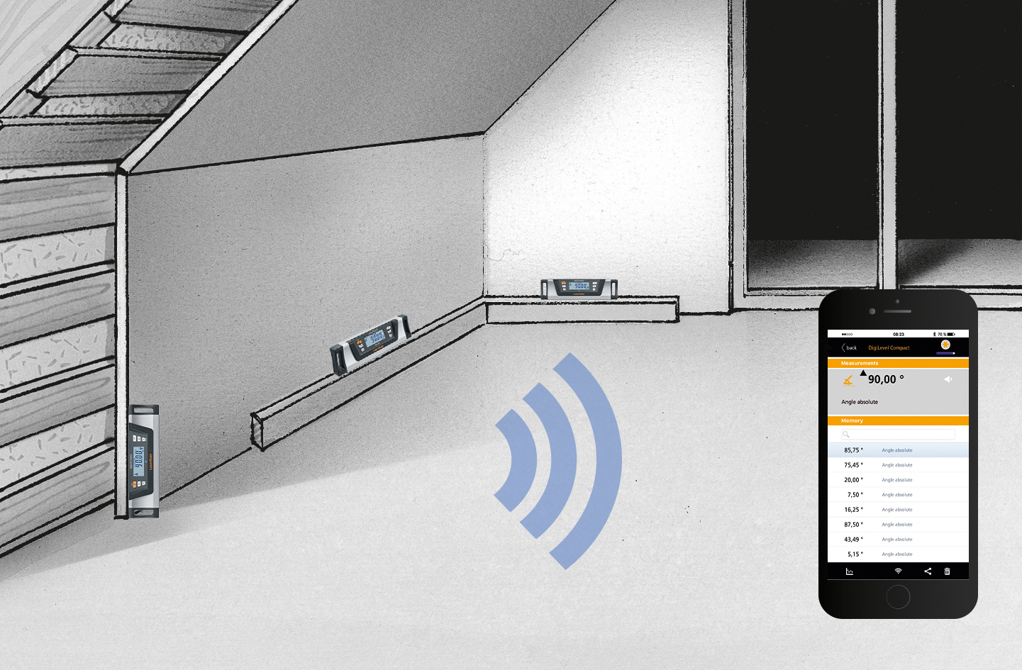 gefräste Messflächen, starke Haftmagnete, Geräte-Kalibrierung erfolgt manuell, Bluetooth®-Schnittstelle zur Fernsteuerung mit dem Smartphone per MeasureNote-App