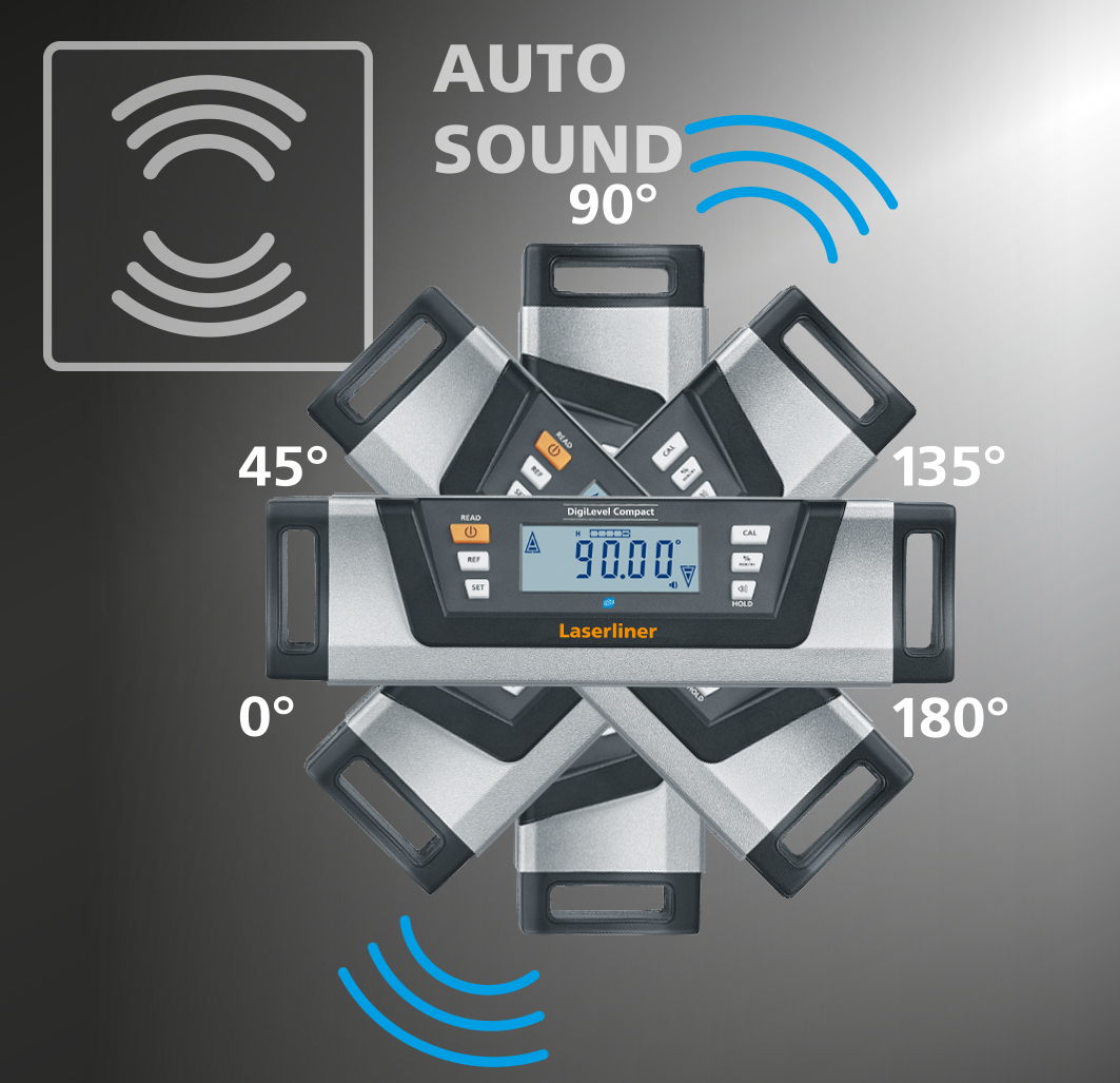 Funktionen: Umschaltung Grad, Prozent und Neigung in mm/m, HOLD, Signalton für die Annäherung an die Horizontale oder Vertikale, Display mit automatischer Drehung der Anzeige bei Überkopfarbeiten, Zwischenwinkel als Referenzwinkel (Null-Punkt) festlegbar, automatische Abschaltung nach 10 min.