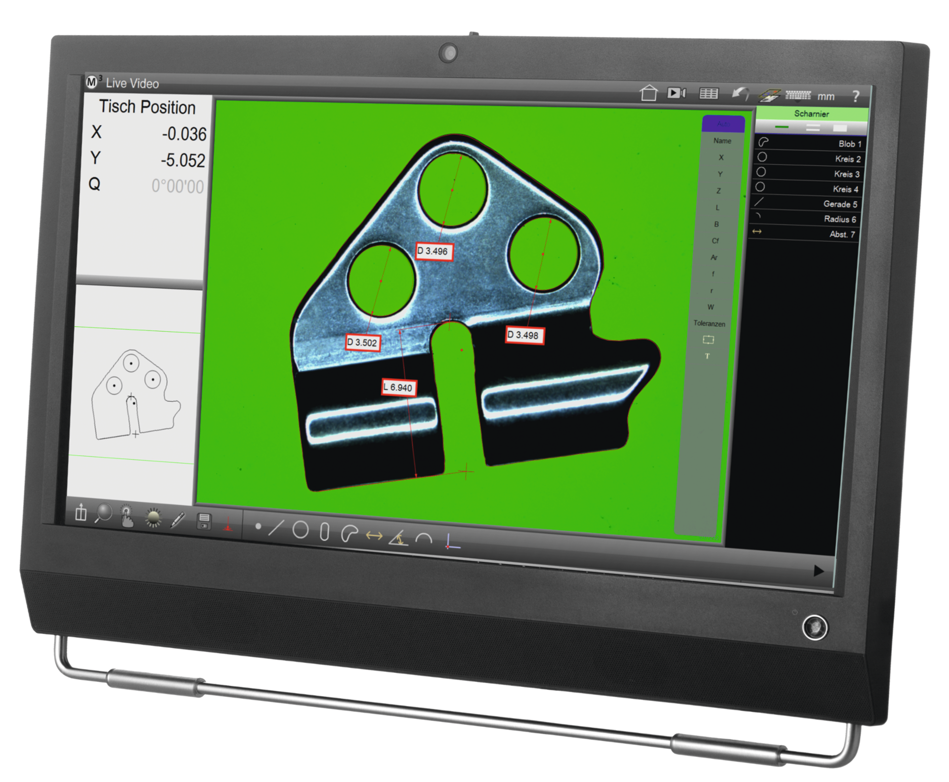 Funktionen: grafische Darstellung der gemessenen Elemente mit Exportfunktion in CAD-Systeme, Drag-and-Drop-Bemaßung in der Teileansicht sowie im Live-Bild, umfangreiche Protokolliermöglichkeiten durch verschiedene Vorlagen (csv, Europa, Toleranz), einfache Toleranzeingabe durch Gruppentoleranzen (Toleranzprüfung nach DIN ISO), optische Ausgabe der Ergebnisse Gut/Schlecht mit Tendenzanzeige, Einzelelementansicht mit grafischer Darstellung der Messpunkte, Ausgabe verschiedener Berechnungsmethoden (Gauß, Pferch-/Hüllkreis, MMK), einfache Messpunkterfassung durch Antippen des Elements im Live-Bild, automatische Teileprogrammerkennung, Speicherung der Grafik und des Live-Bildes mit Messergebnissen