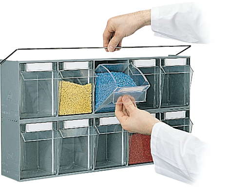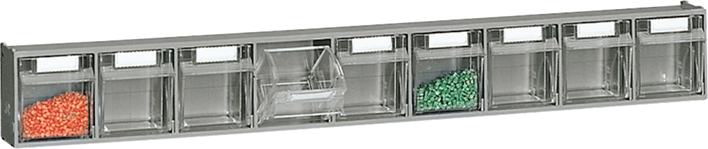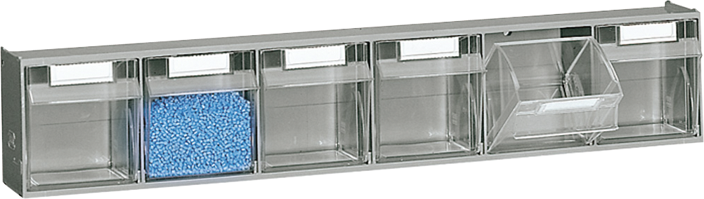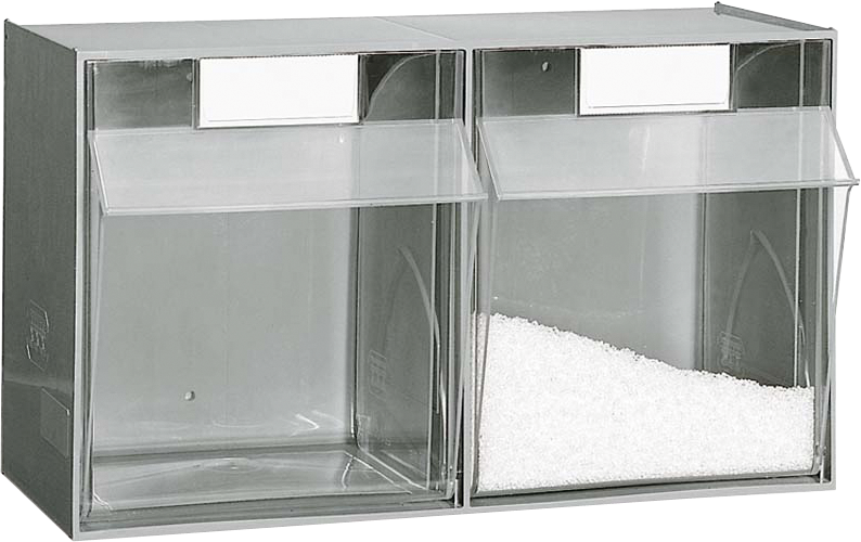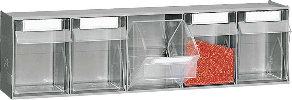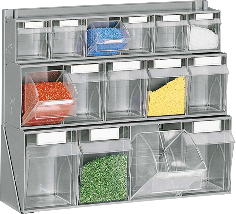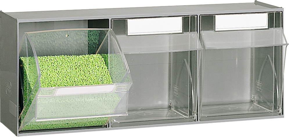 Klappbox zur Lagerung von Kleinteilen, Behälter aus Klarsicht-Polystyrol sorgt für eine schnelle Übersicht, ABS-Modulgehäuse immer mit der gleichen Außenbreite zur optimalen Gestaltung