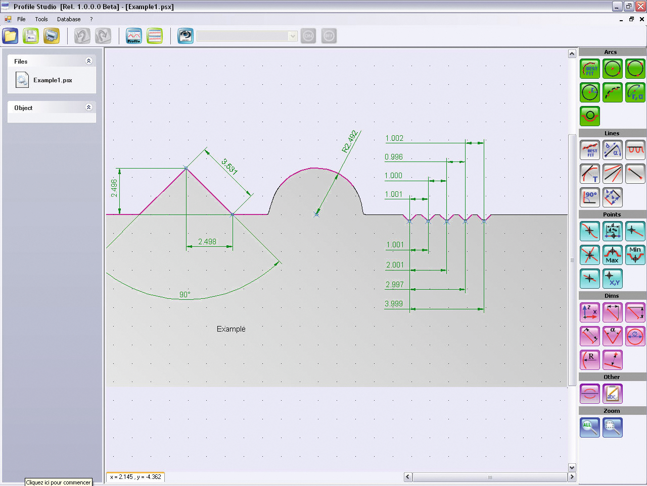 Funktionen: die Einstellung und Auswertung der jeweiligen Messungen erfolgt in einfacher und schneller Weise, nach Festlegung der geometrischen Formelemente (Punkt, Gerade, Kreisbogen) können die Maße entsprechend eingefügt werden, das Drehen sowie die Symmetrie des gemessenen Profils ermöglichen eine passende Ausrichtung, dank zugeordneter Grenzwerte können die Messergebnisse auf einen Blick nachgeprüft und benutzerdefinierte Prüfberichte erstellt werden