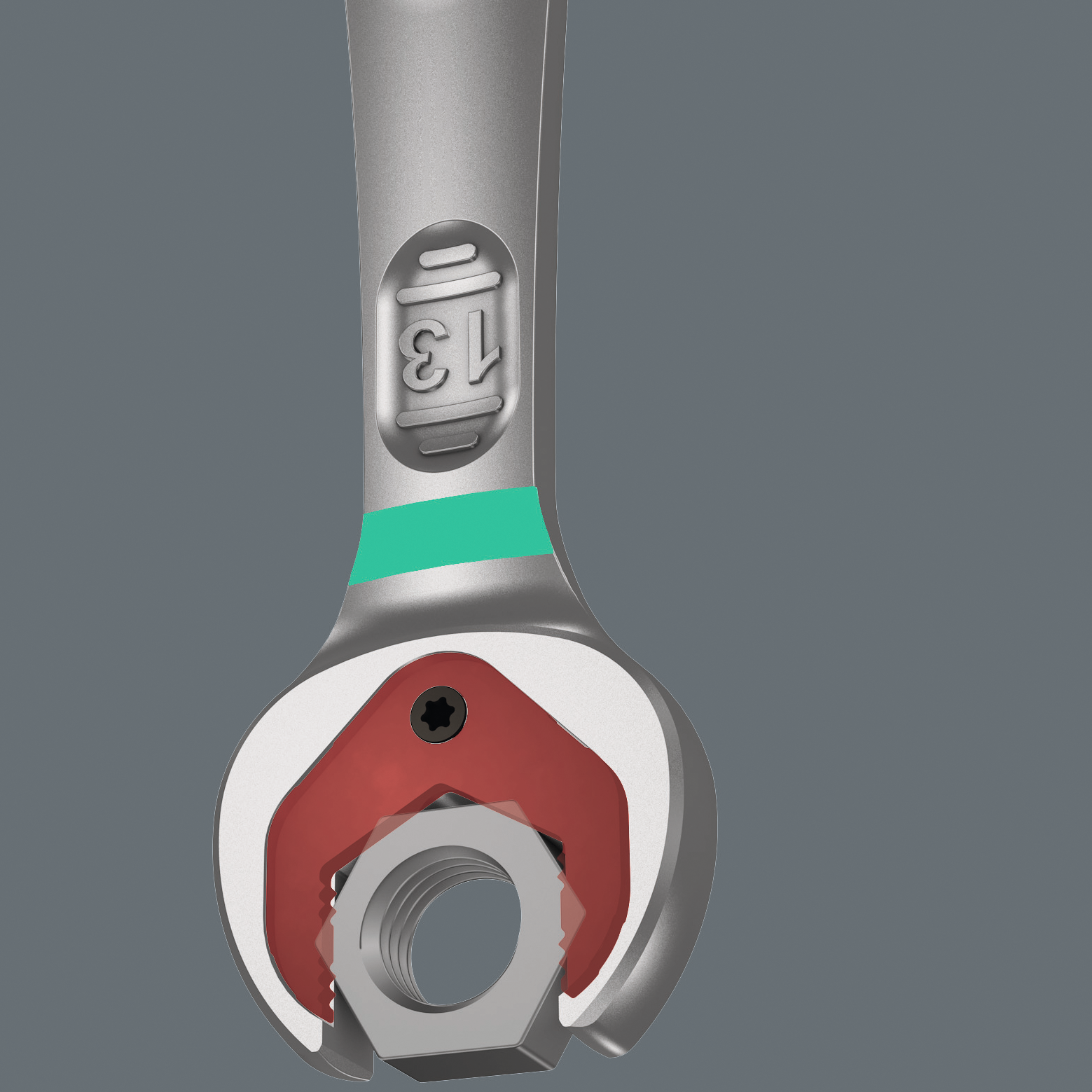 Maulseite mit neuartiger Haltefunktion, Herunterfallen der Schraube oder Mutter kann dadurch effektiv vermieden werden, durch Endanschlag wird die Abrutschgefahr vom Schraubenkopf nach unten verringert, Verletzungsgefahr wird dadurch minimiert, Maulseite mit sehr kleinem Rückholwinkel von 30°