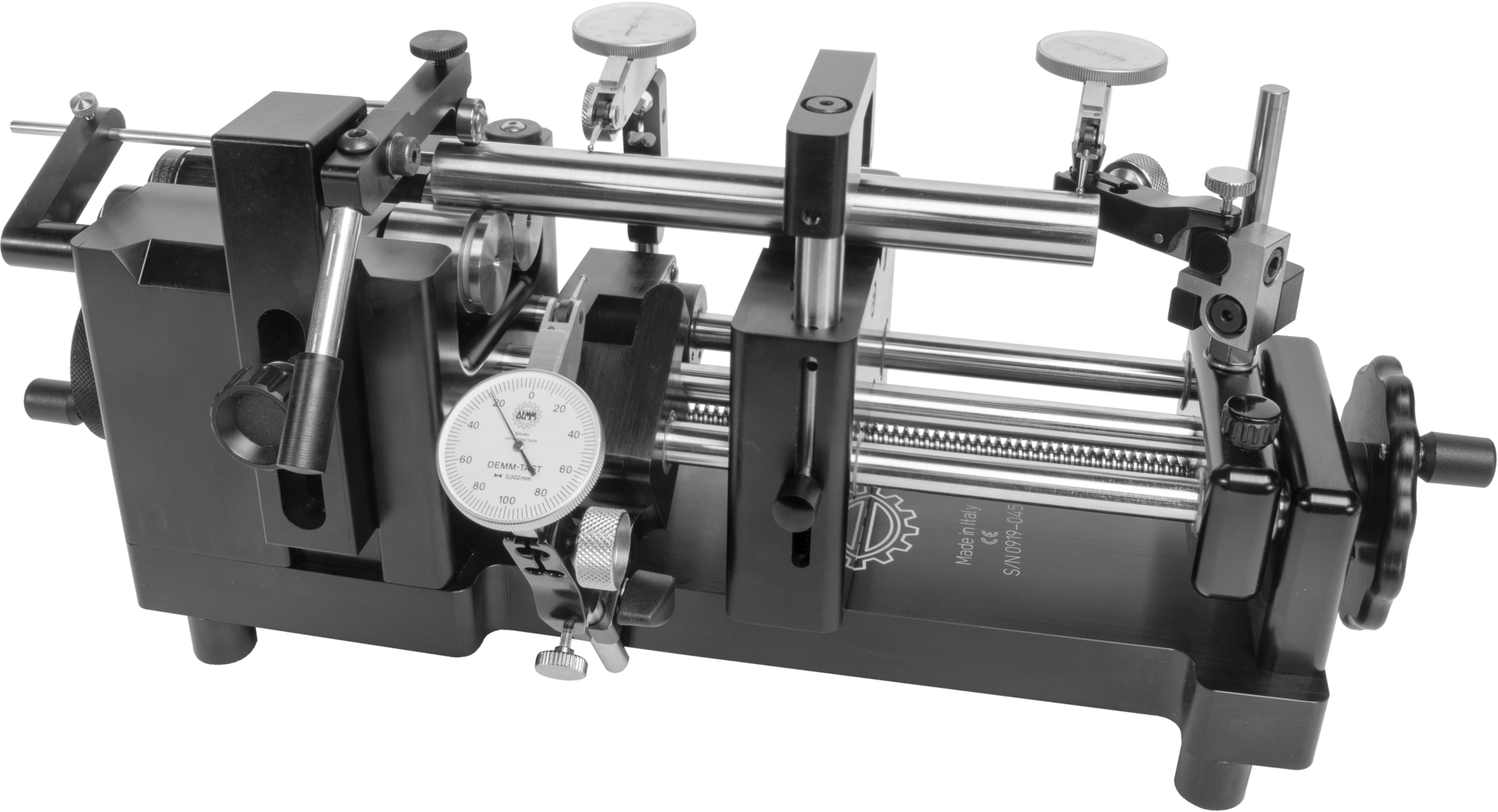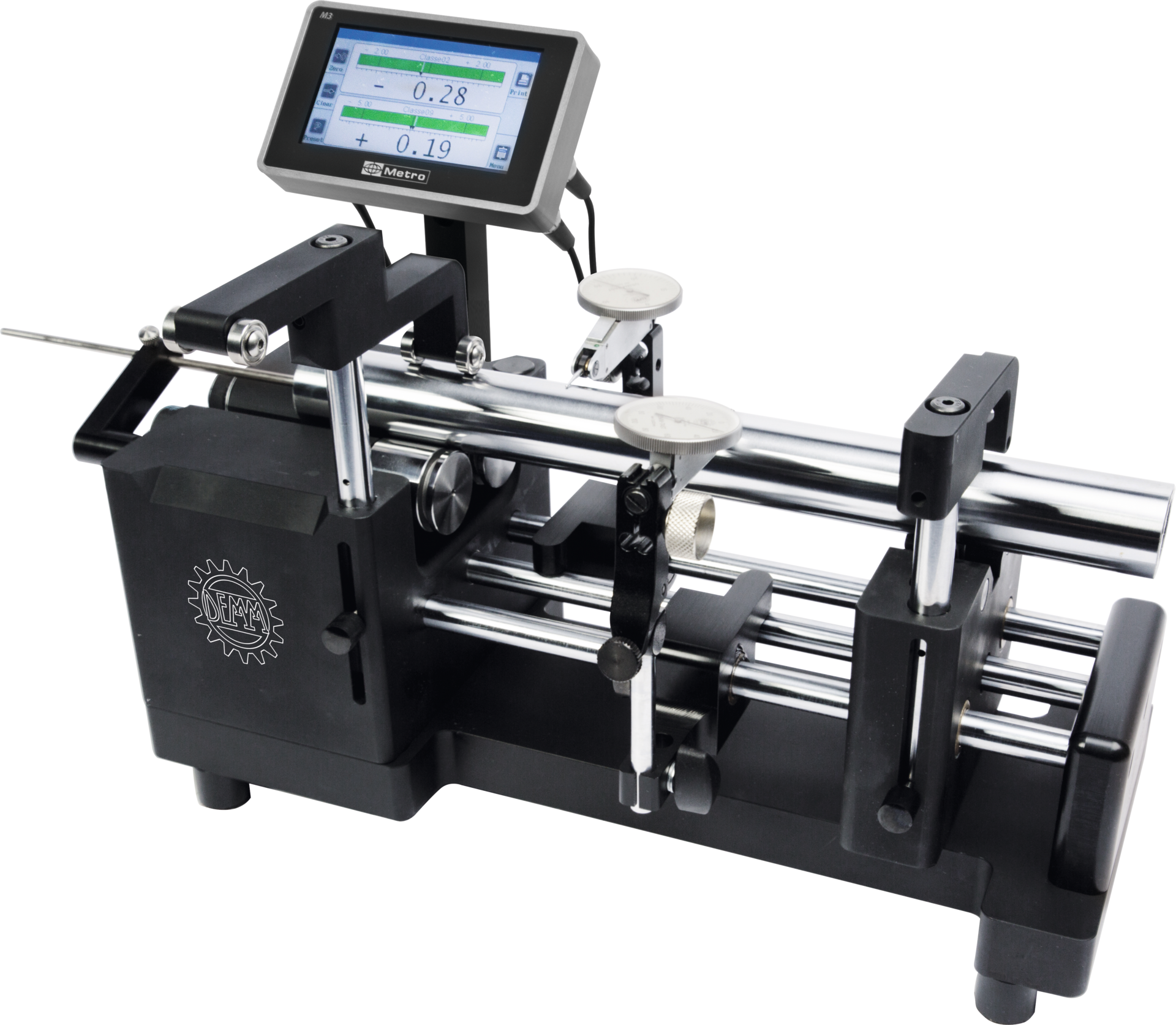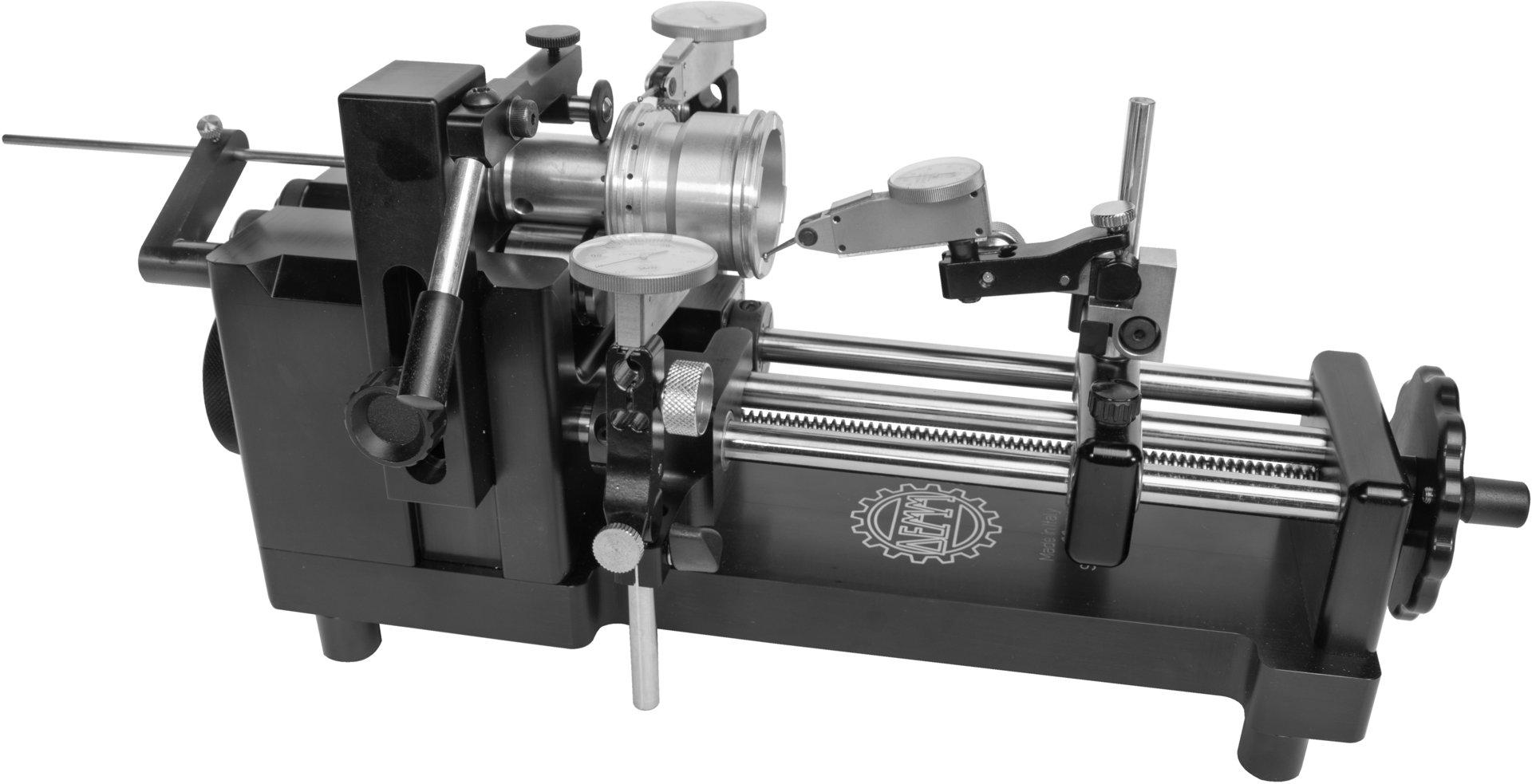 Rundlaufprüfgerät, 2 Auflagerollen, Niederhalter (federbelastet), Werkstückanschlag (längen- und höhenverstellbar) und 2 Stative