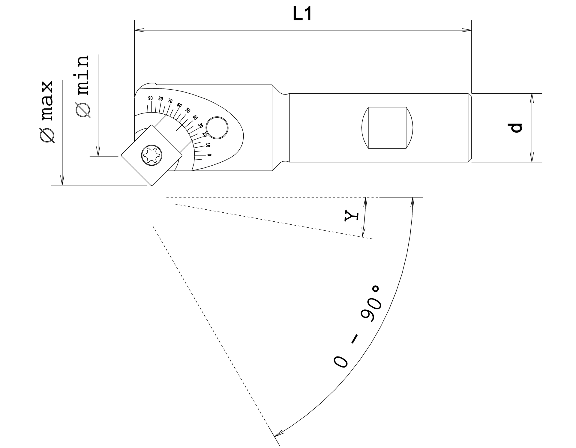 verstellbar, Grundkörper aus hochwertigem Vergütungsstahl, direkt eingebettete vierschneidige Wendeschneidplatte ohne Kassette für hohe Stabilität, ermöglicht kürzeste Bearbeitungszeiten durch hohe Schnittwerte, stufenlos von 0° bis 90° verstellbar, Skala tiefengraviert für eine lange Lebensdauer