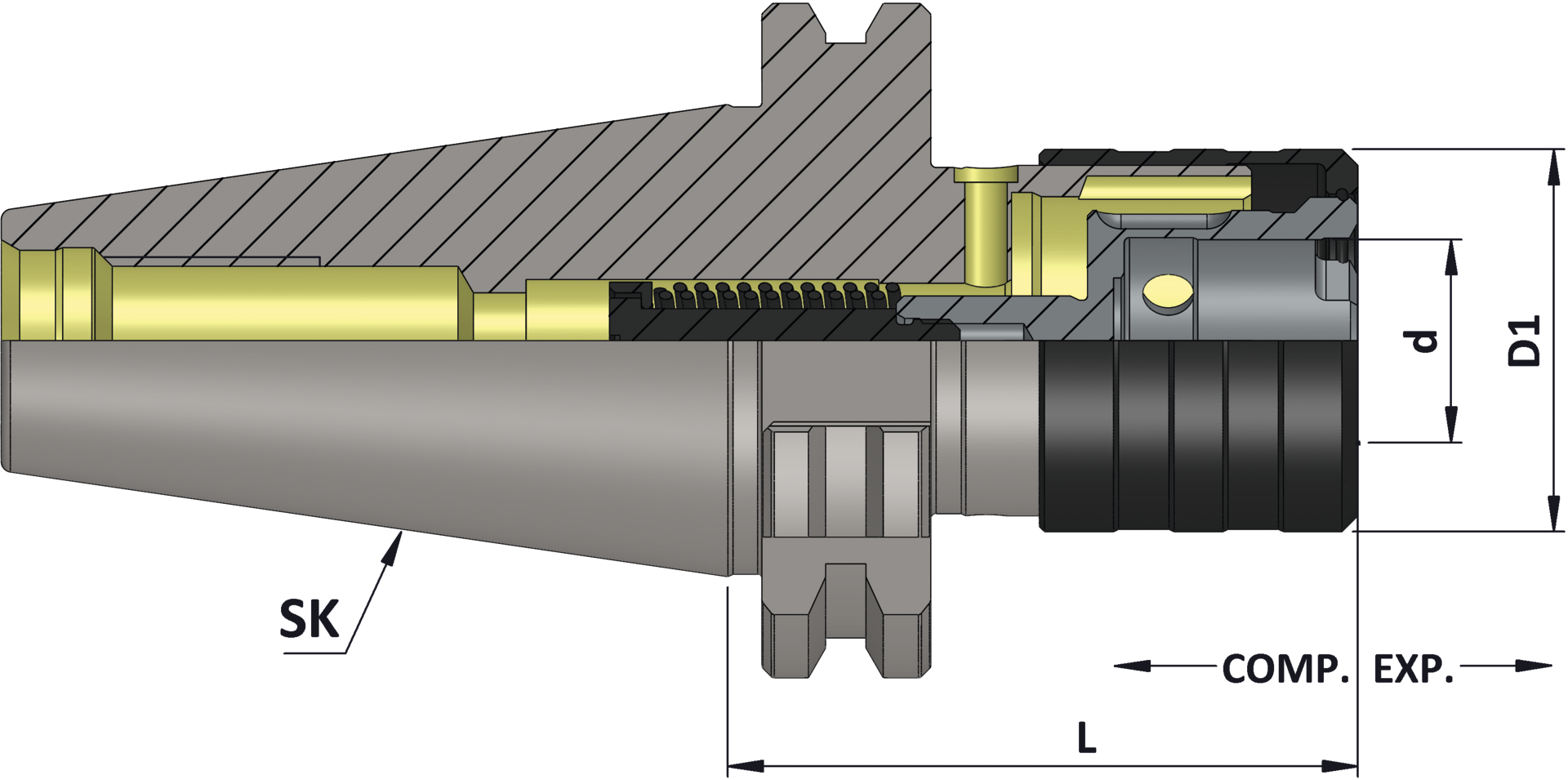 | Einsatz: | zur Aufnahme von Schnellwechsel-Einsätzen für Gewindebohrer auf Bearbeitungszentren ohne Synchronspindel |