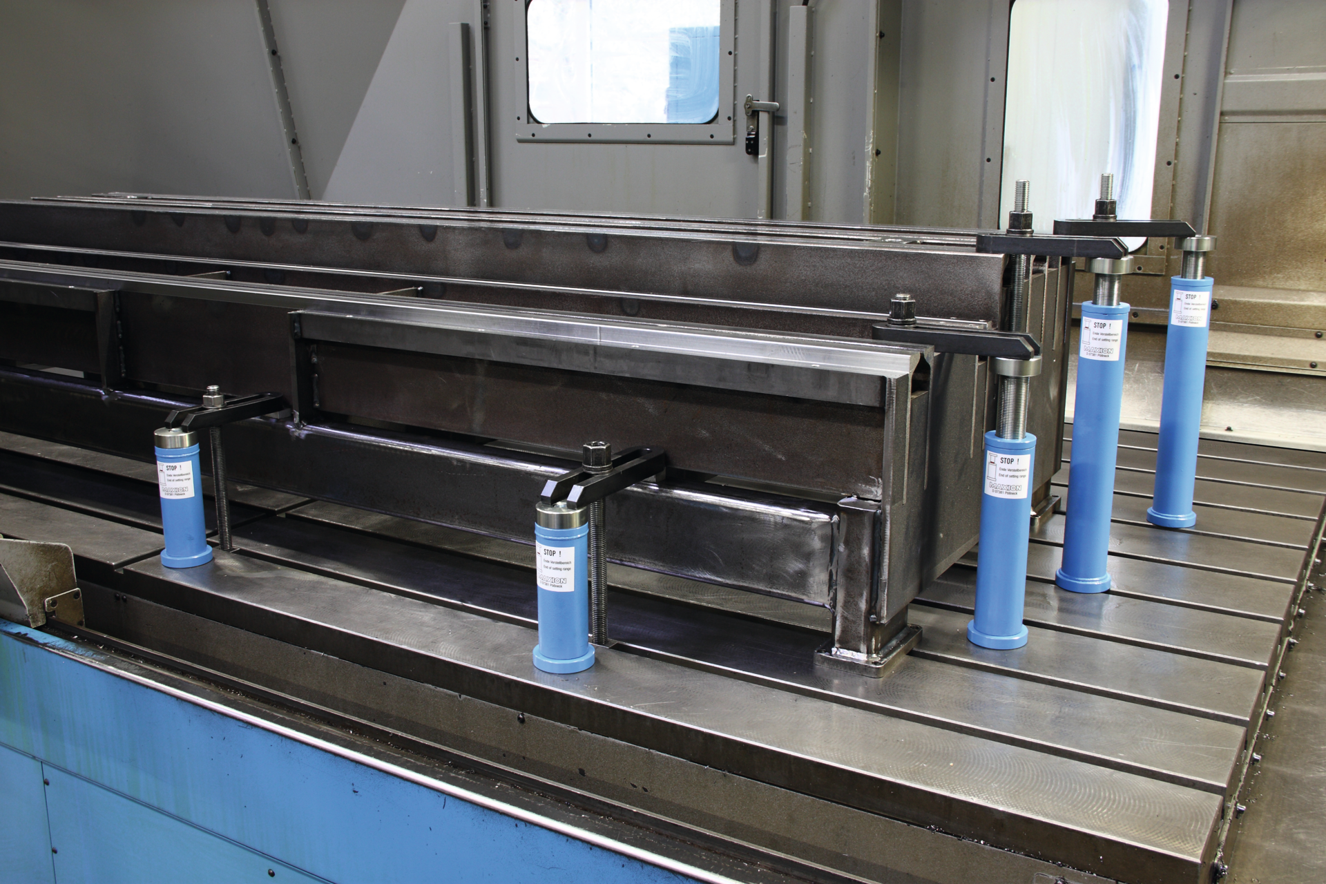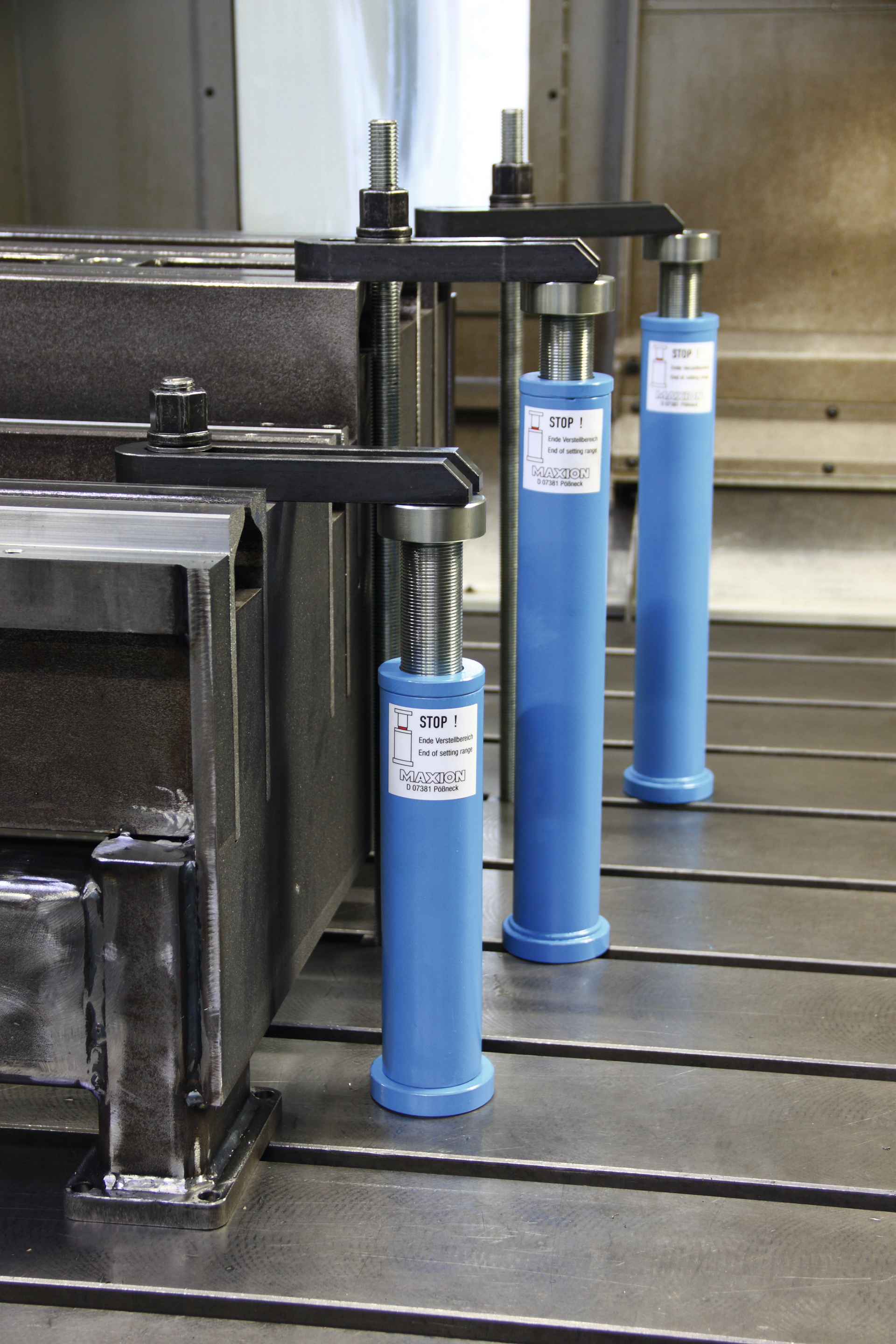 Spindel aus Maschinenbaustahl, verzinkt und chromatiert, Körper aus Präzisionsstahlrohr, blau beschichtet, Höhe schnell voreinstellbar mit Innensechskant-Schlüssel und regulierbar durch metrisches Feingewinde, selbsthemmend, übereinander angeordnet anwendbar, Gewinde M16 im Fußteil