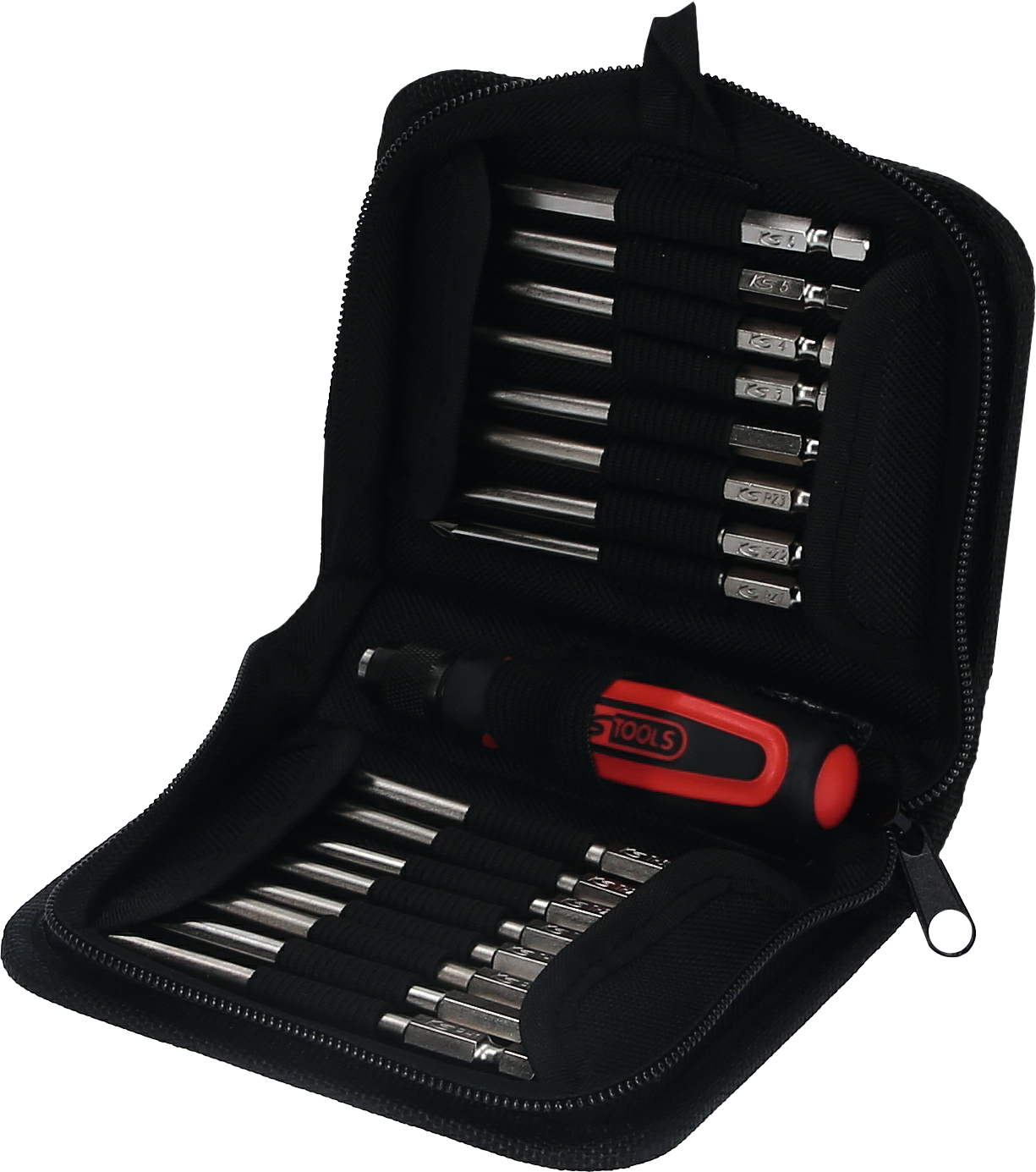 - 16 Langbits (Länge 89 mm): Schlitz 5,5 mm, Phillips® PH1 - PH2 - PH3, Pozidriv® PZ1 - PZ2 - PZ3, Sechskant mit Stirnlochbohrung SW 3 - 4 - 5 - 6 mm, Torx® mit Stirnlochbohrung TB10 - TB15 - TB20 - TB25 - TB30