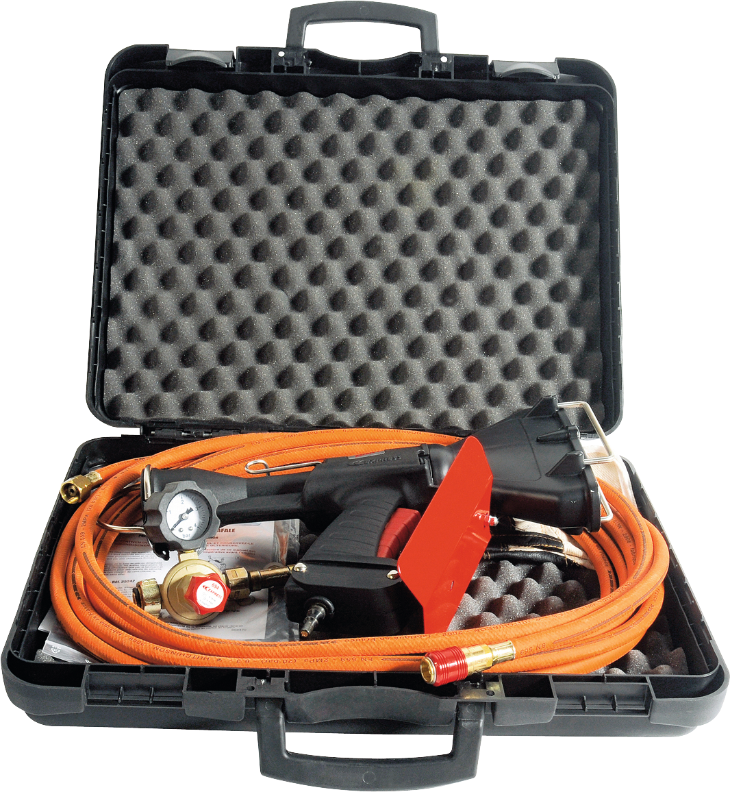 Schrumpfpistole, Druckminderer mit Manometer, Propanschlauch 8 m, Benutzerhandbuch, Wärmereflektor, Handschuhe und Kunststoffkoffer
