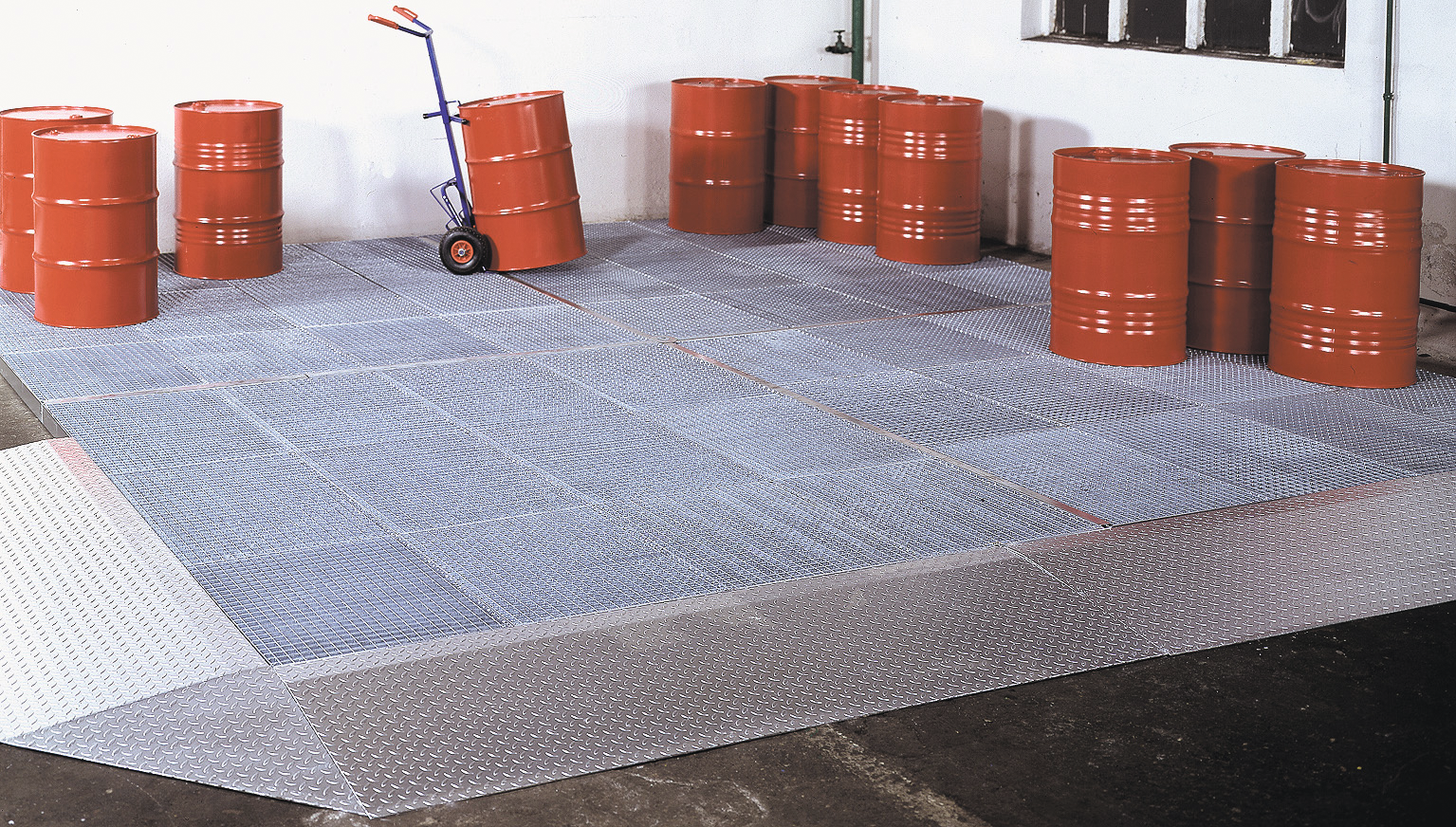 stabile Konstruktion aus 3 mm Stahlblech, mit Hubwagen befahrbar, Einzelsegmente beliebig kombinierbar, hoher Korrosionsschutz durch Verzinkung, herausnehmbare feuerverzinkte Gitterroste, Abstand der Elemente beim Verlegen: 40 mm