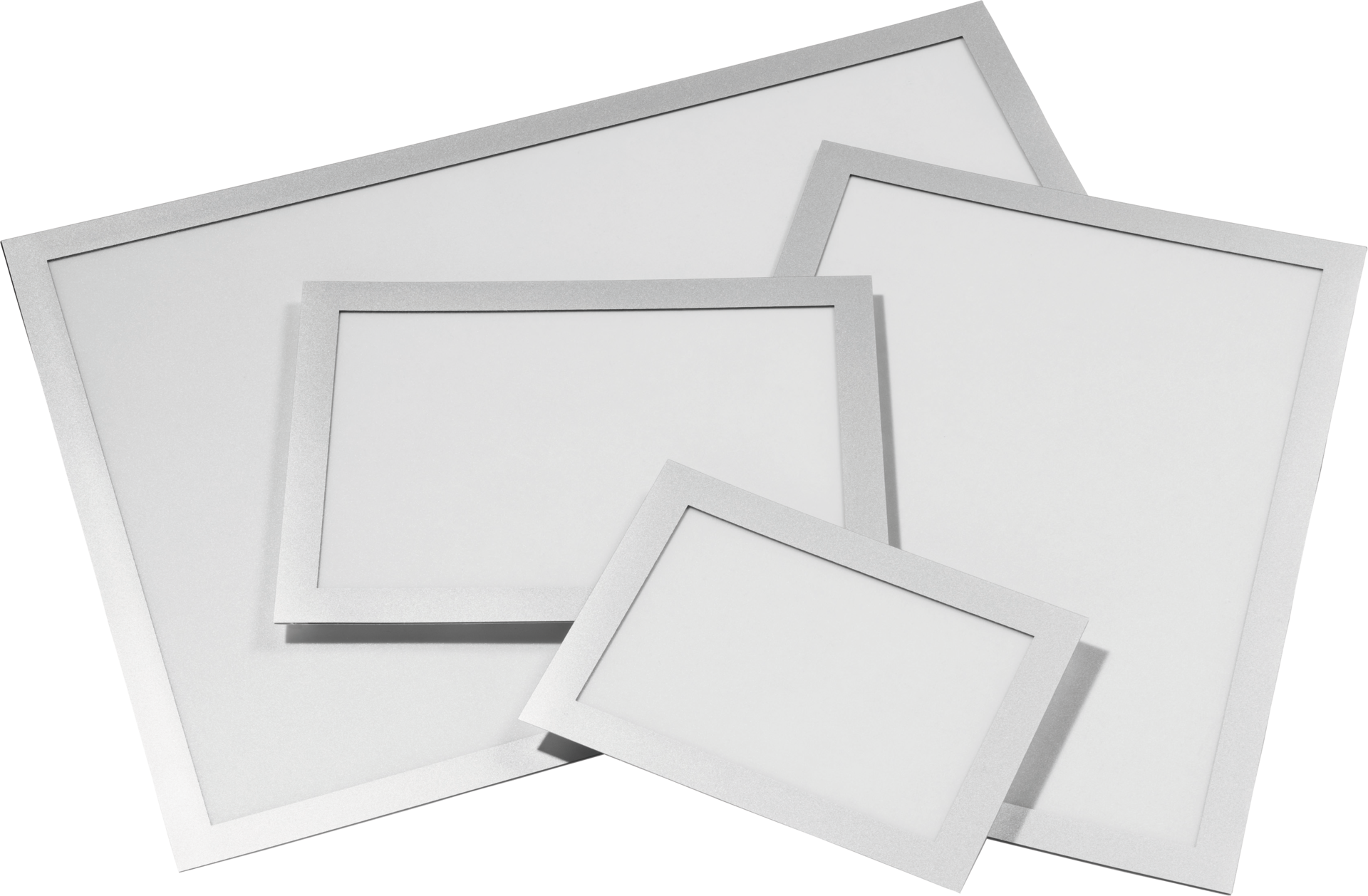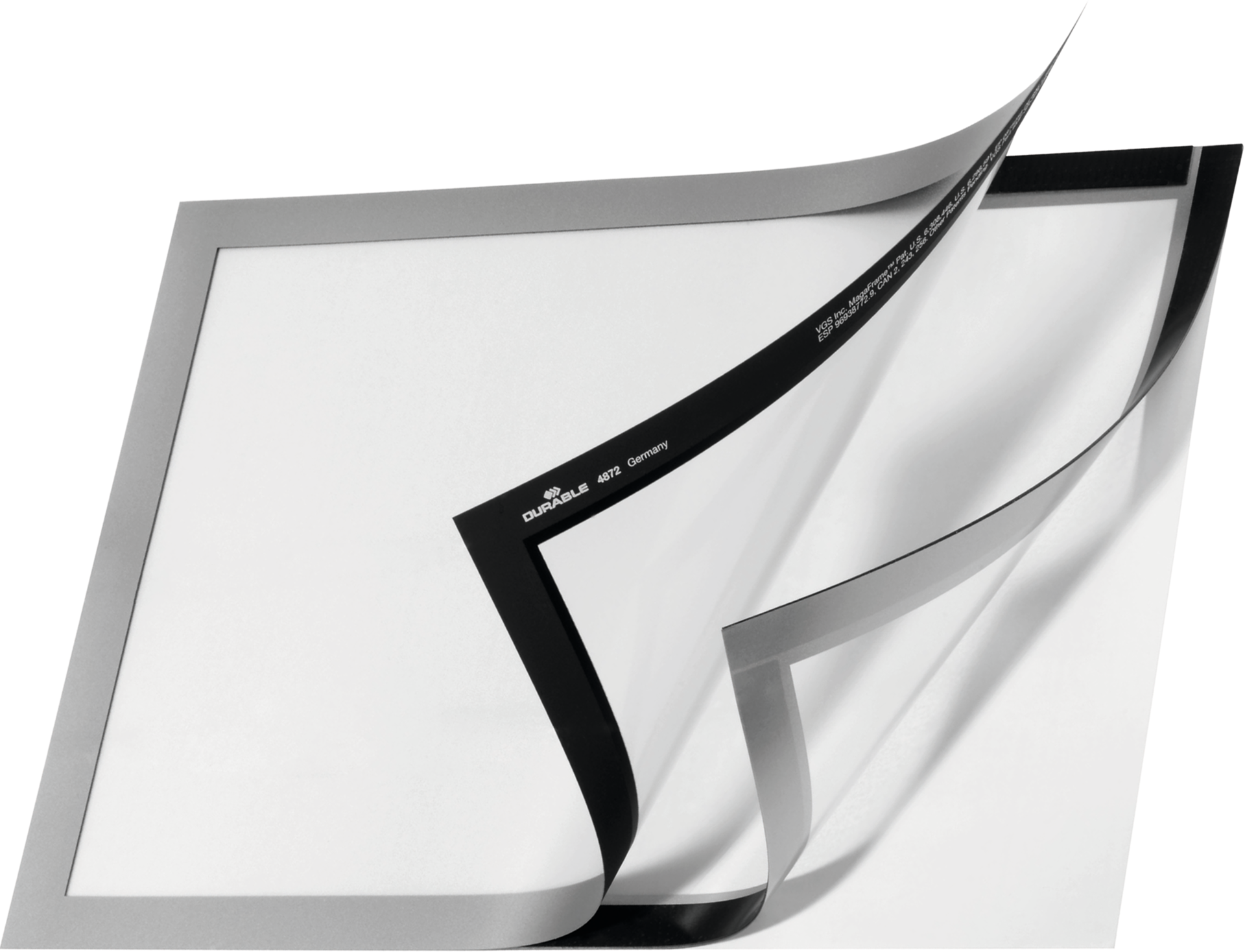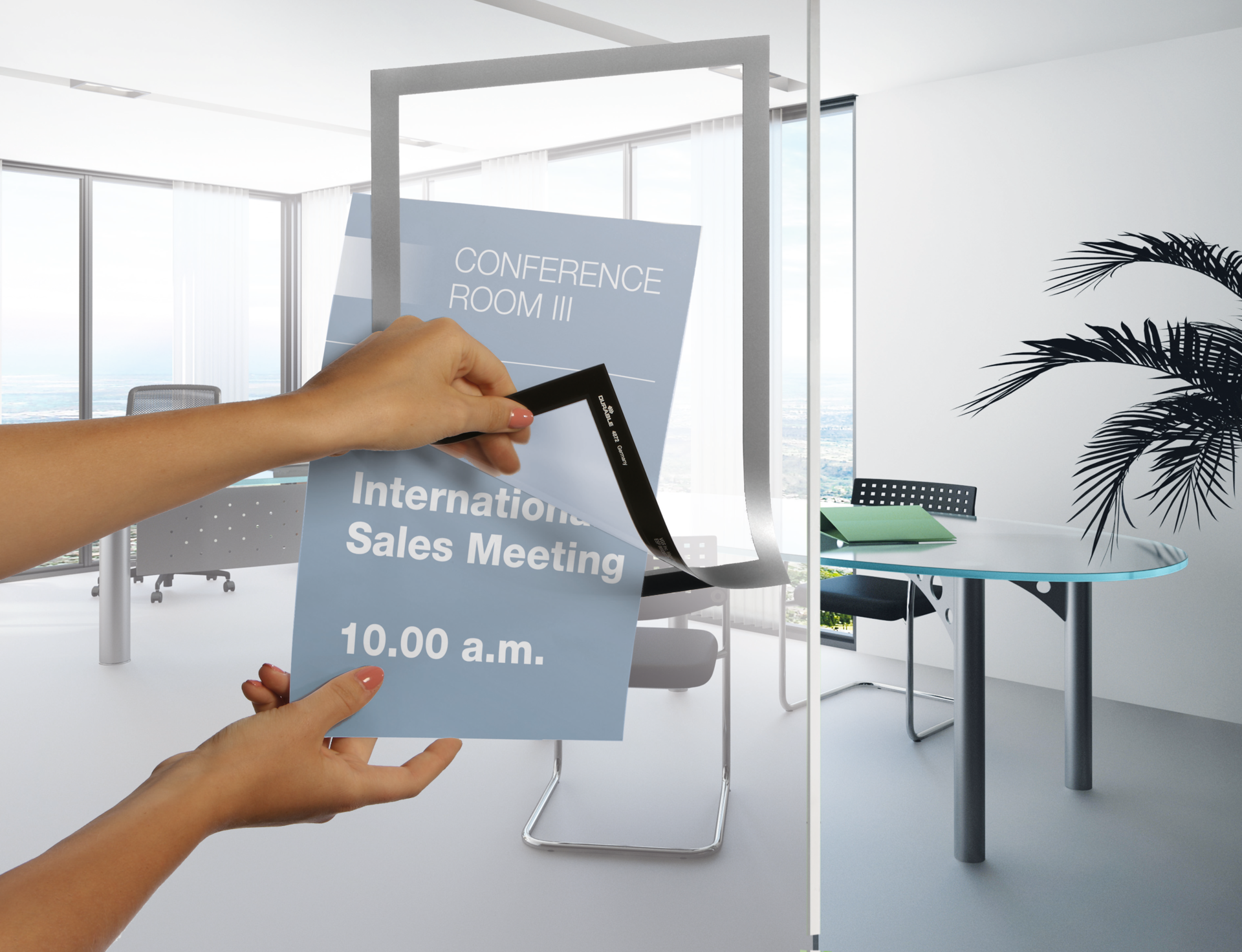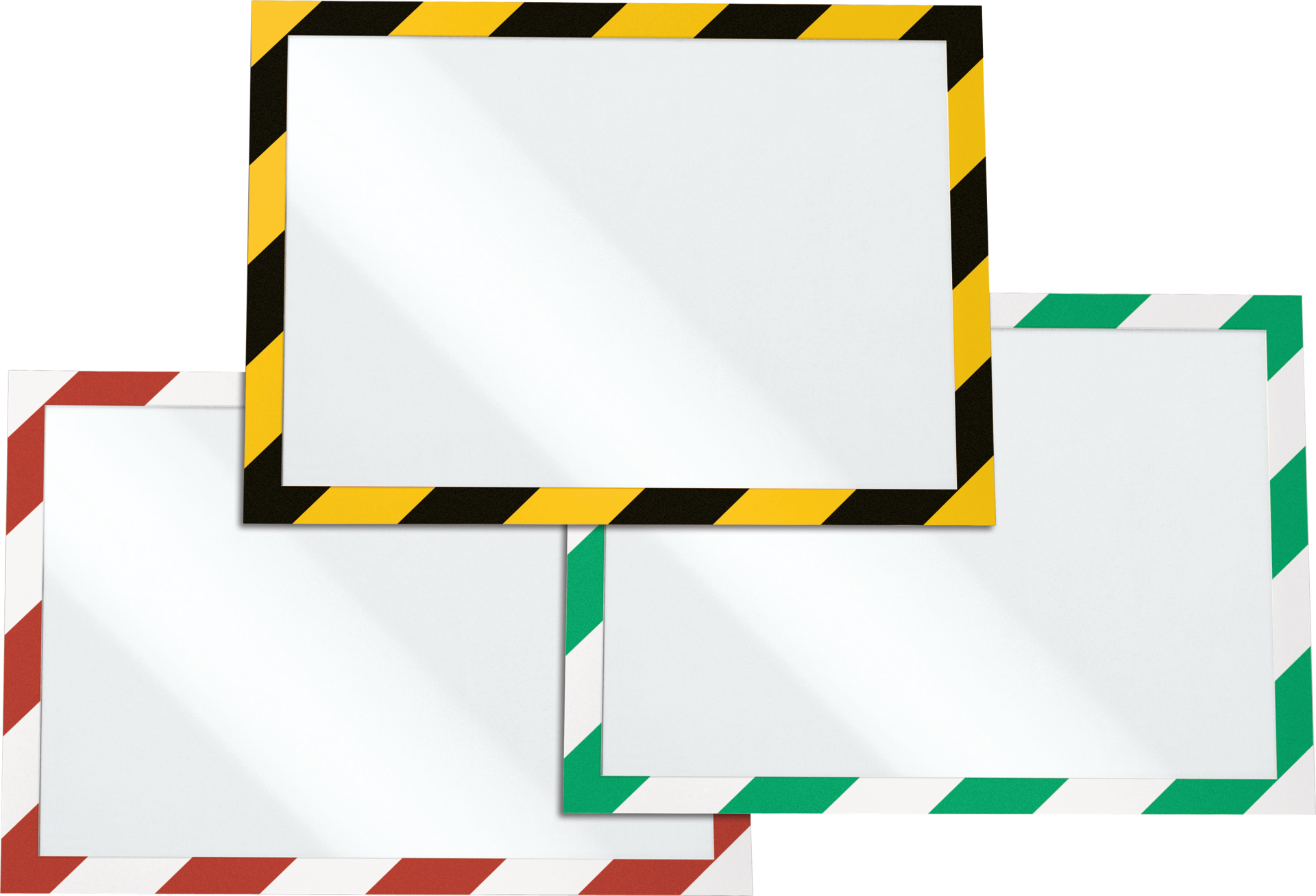 selbstklebender Informationsrahmen mit aufklappbarer magnetischer Vorderseite, kann auf glatten und tragfähigen Oberflächen angebracht und wieder neu angeklebt werden, beidseitig lesbar z. B. auf Glastüren, kein magnetischer Untergrund erforderlich, die Variante 5, 6 und 7 sind Sicherheitsfarben gemäß DIN ISO 3864-4 schraffiert