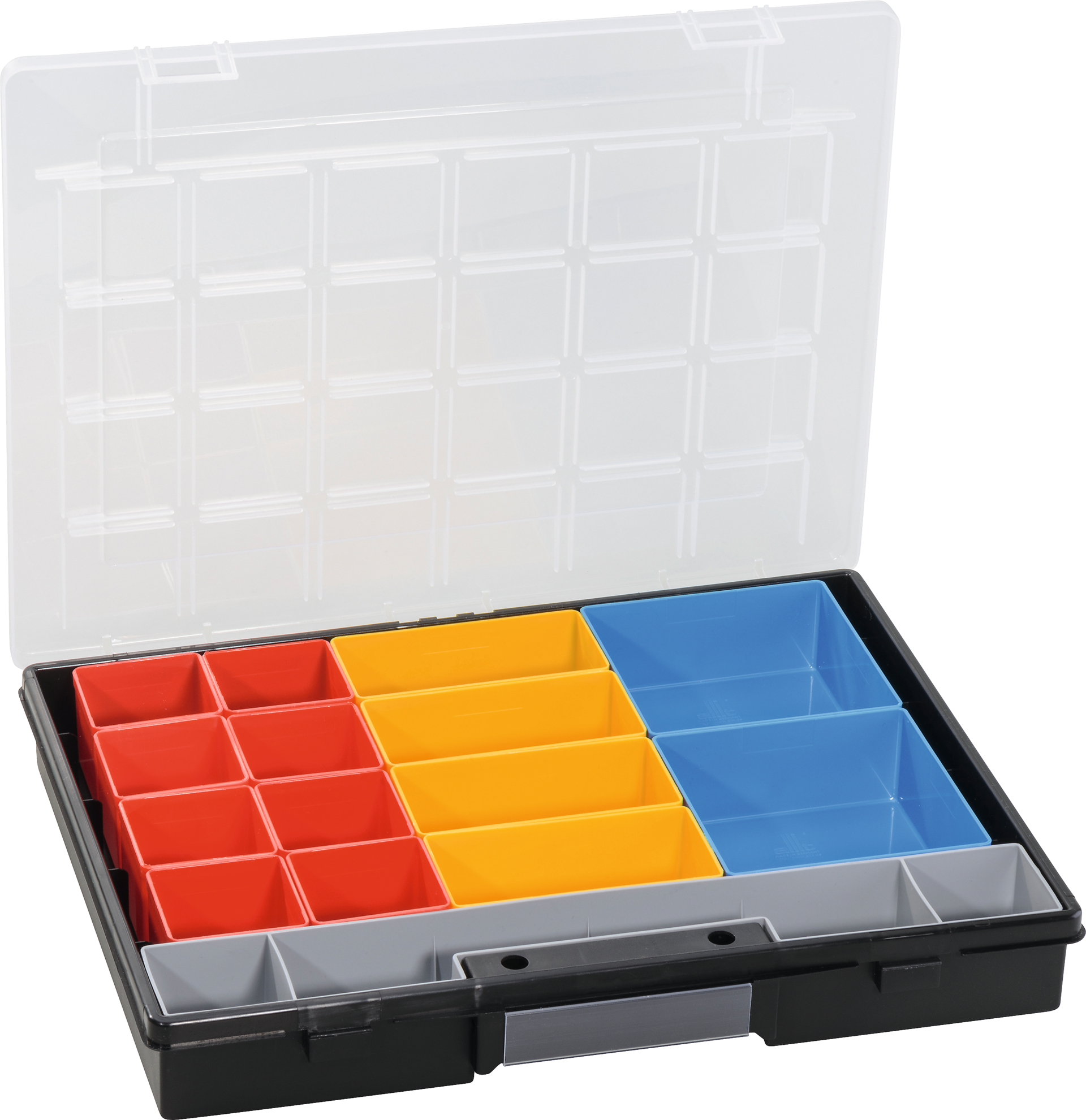 Sortimentskästen FLEX sind mit herausnehmbaren farbigen Boxen bestückt, transparentem Deckel, Fächer schließen fest mit Deckel ab, die Griffmulde ist etikettierbar. Einsatzboxen aus Polystyrol, Unterteil und Deckel aus hochschlagfestem Polypropylen