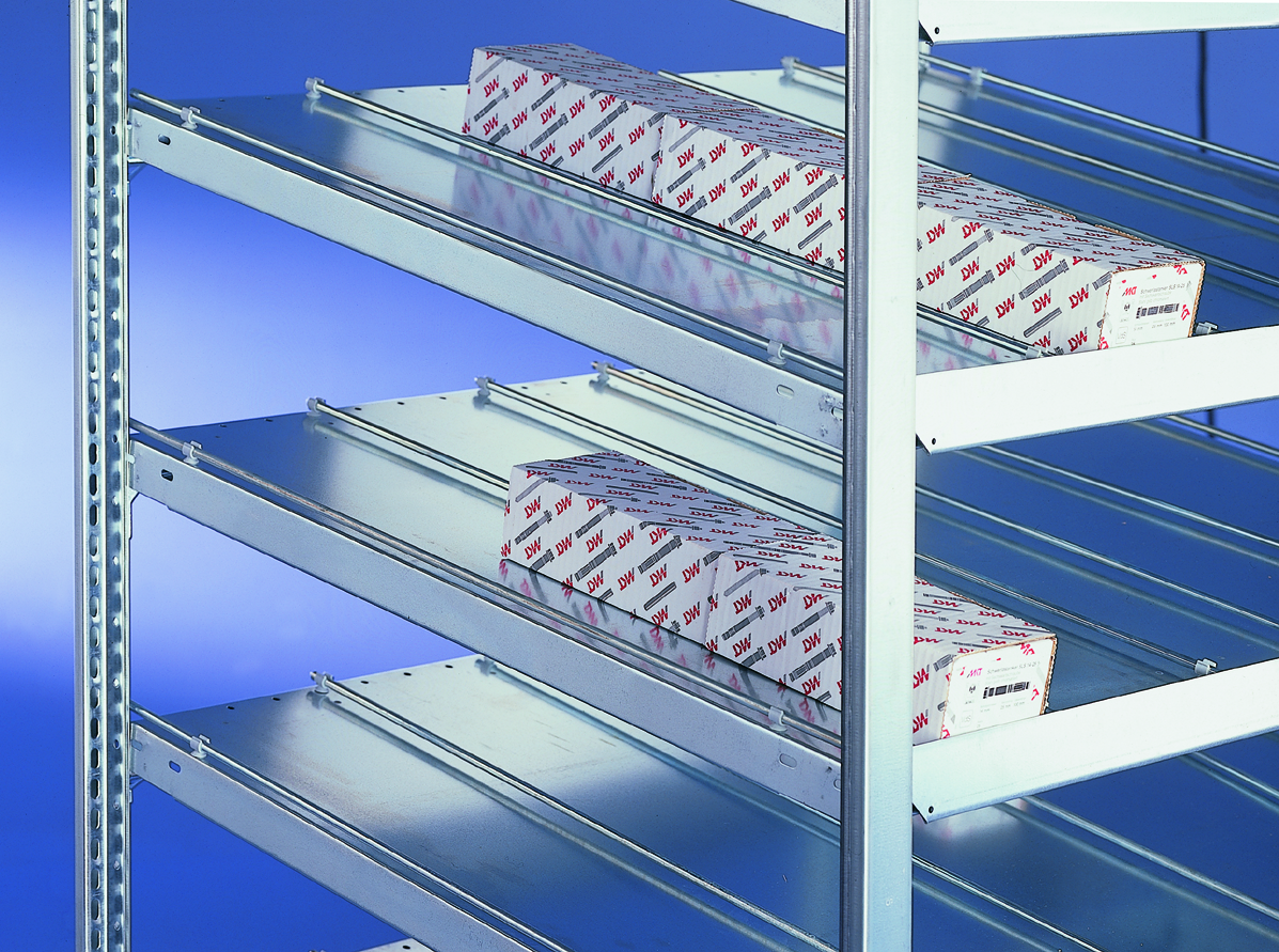 Regal nach FiFo-Prinzip (First-in/First-out), Ware gleitet automatisch über die 14° schrägen Fachböden, leichte Entnahme durch schmale Vorderanschlagsleiste, Fachebenen im Raster 25 mm verstellbar, mit Fachteilerdrähten zur Unterteilung, Rahmen unmontiert