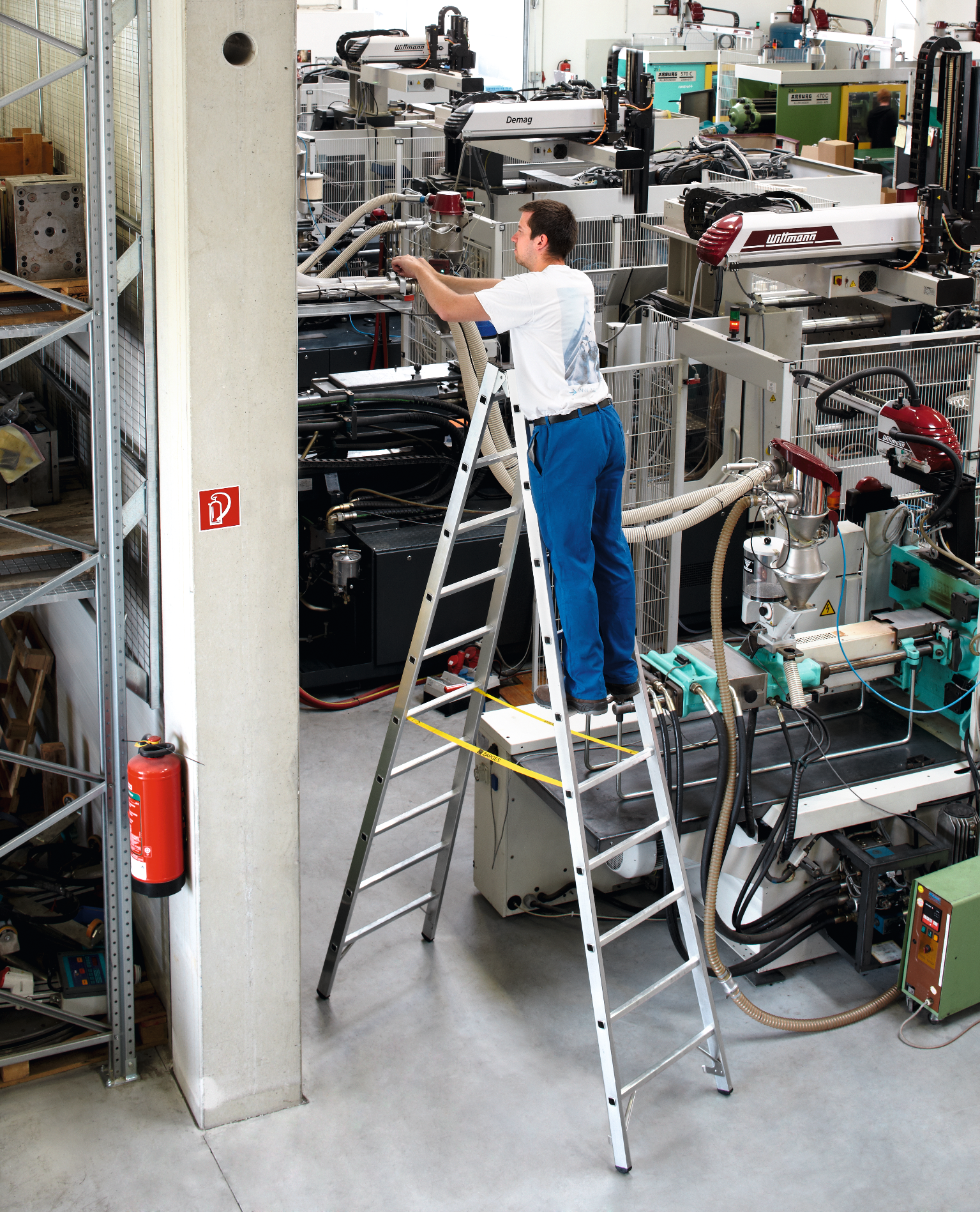 Sprossen-Holm-Verbindung durch Qualitätsbördelung, Sprossen und Holme aus Aluminium-Strangpressprofilen, Scharniere aus Stahl, Spreizsicherung durch Perlongurte