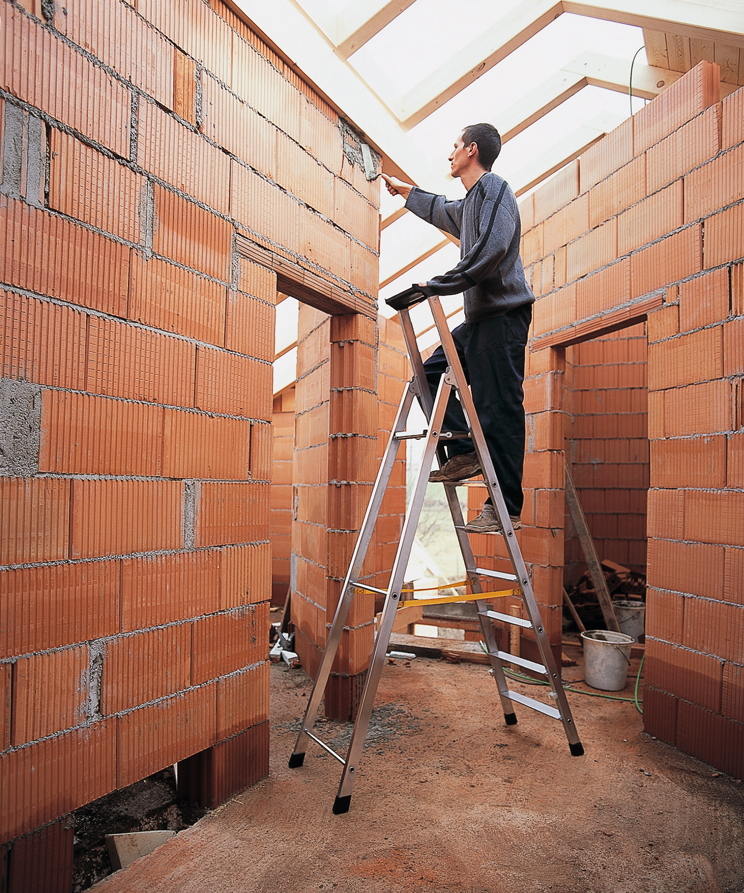 Plattform mit rutschsicherer Riffelung, Stufen-Holm-Verbindung durch Qualitätsbördelung, Ablageschale aus Kunststoff, Stufen und Holme aus Aluminium-Strangpressprofilen, Spreizsicherung durch Perlongurte mit eingenähter Befestigungslasche ab 7 Stufen
