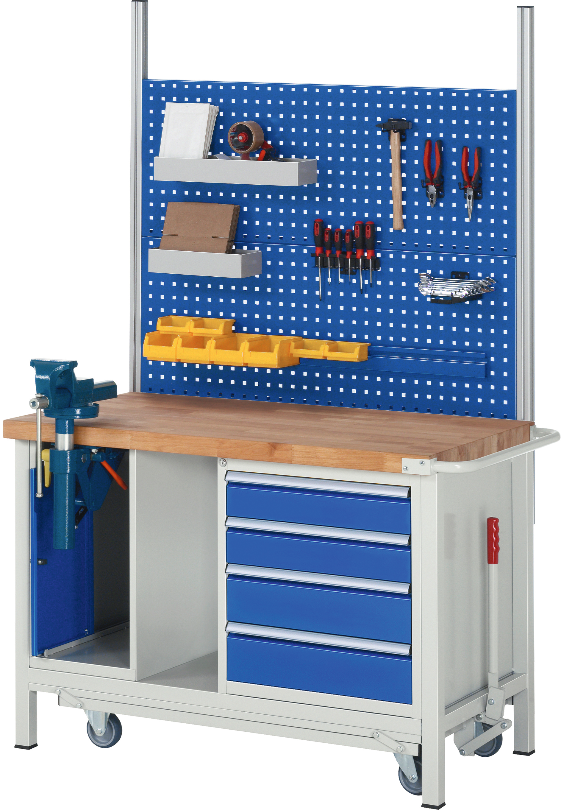 Querträger wird hinten unter der Tischplatte an das Gestell werksseitig angeschweißt (Werktische/Werkbänke), System-Stützen (Aluminiumprofil 40 mm x 40 mm) werden am Querträger angeschraubt (Höhe einstellbar) und laufen hinter der Tischplatte nach oben, so dass die gesamte Tiefe der Tischplatte frei bleibt (kein Verschrauben auf der Tischplatte)