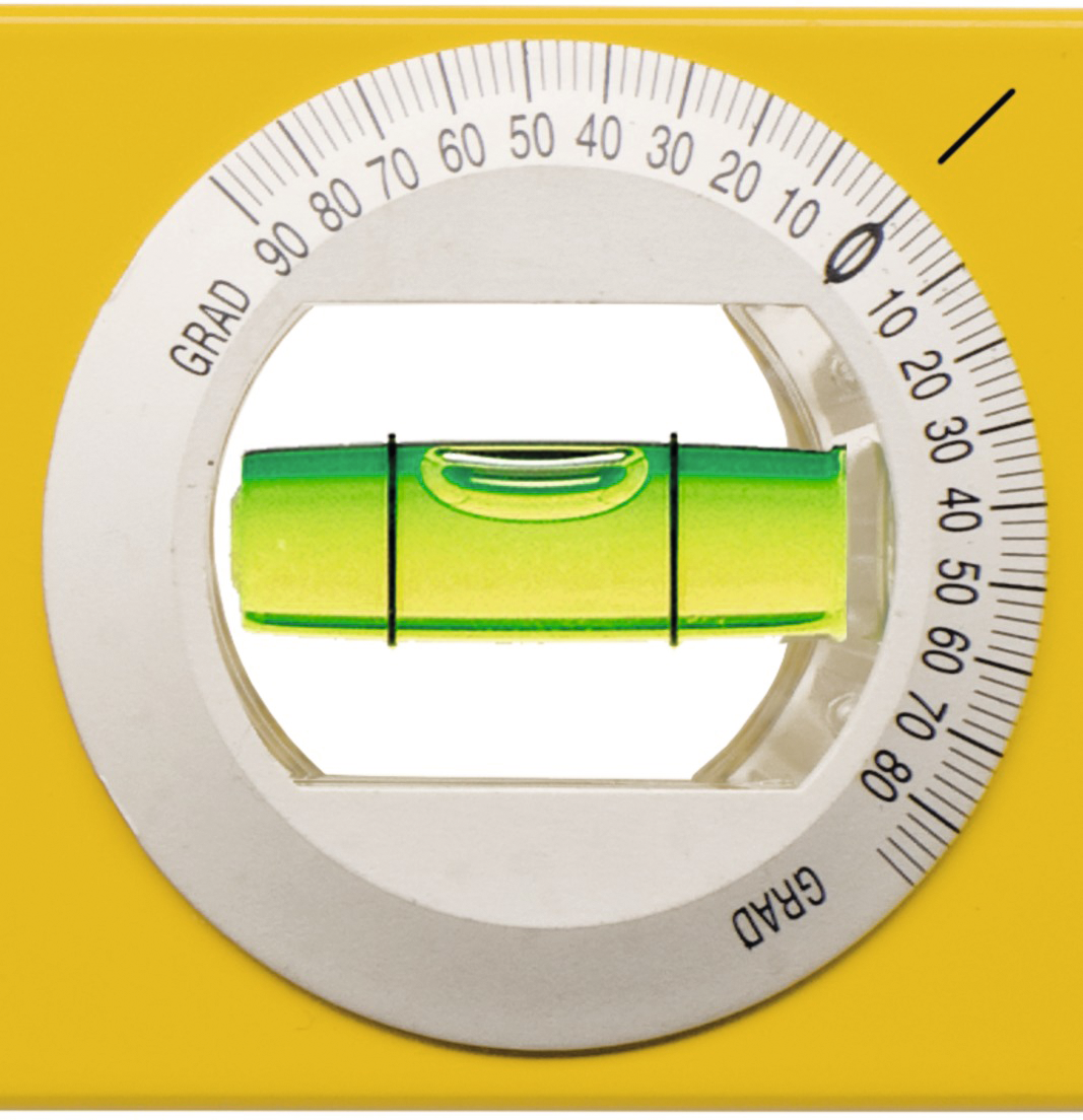 tonnenförmige Horizontal- und Vertikallibelle aus Plexiglas, drehbare Winkellibelle mit 90°-0°-90°, stoßdämpfende Kunststoffendkappen, starke Magnete