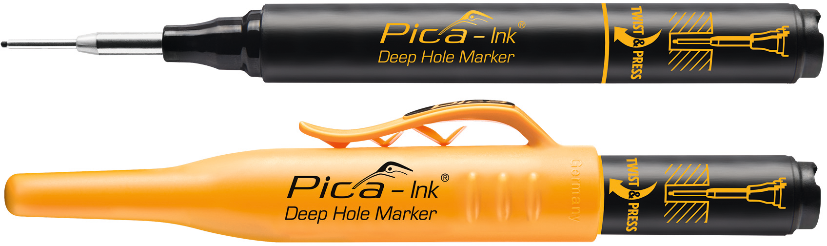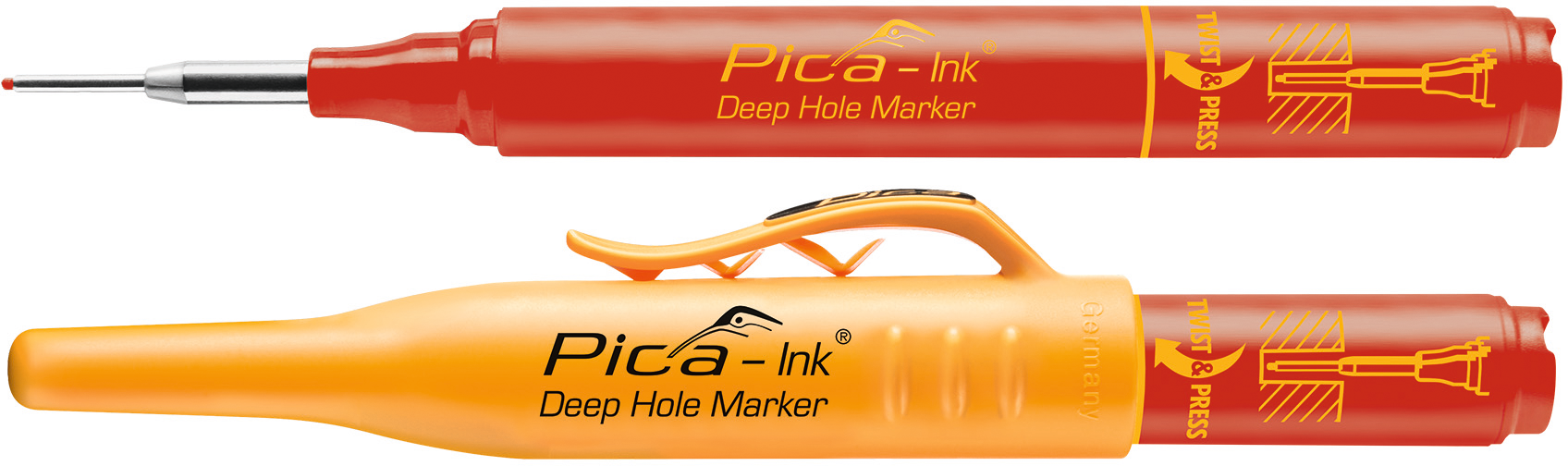 selbstnachstellende und patentierte Teleskopspitze Ø 2 mm aus Edelstahl, für Löcher größer Ø 2 mm, Tinte permanent, wasserfest, wenn der Marker ausgetrocknet ist die Spitze mit einer Zange um 180° drehen und soofort weiter markieren, praktischer Köcherschoner mit Spezialclip, Offenlagerfähigkeit ca. 1 Tag